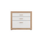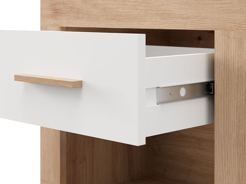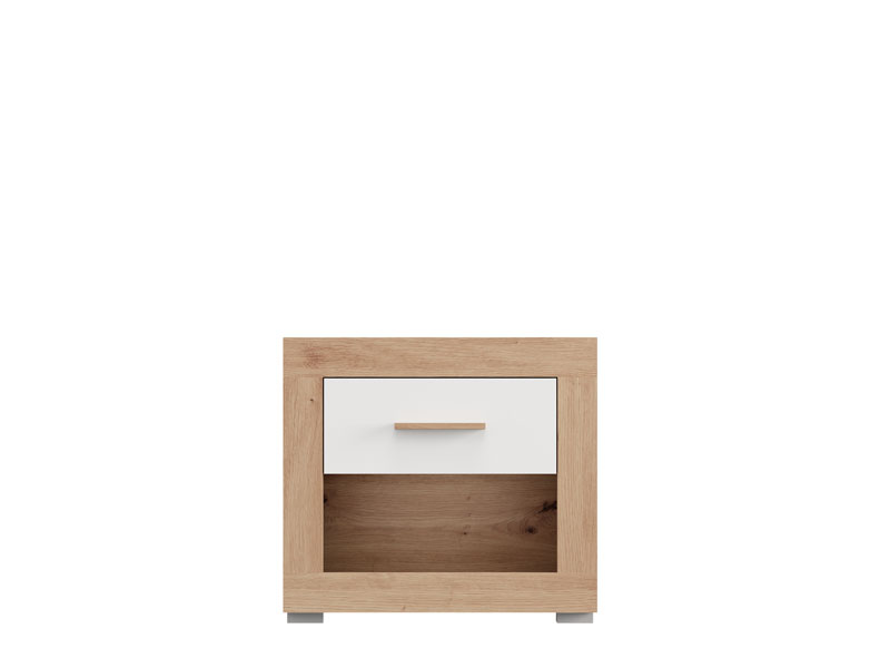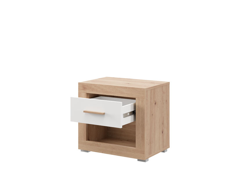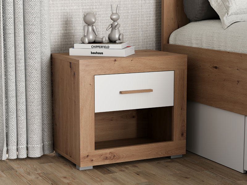 Der Nachttisch CARTENA NO1F, ausgeführt in der Kombination aus opak-weißem Dekor, Artisan-Eiche-Dekor und Artisan-Eiche-Folie, trägt zu einem modernen und eleganten Erscheinungsbild des Schlafzimmers bei und bietet gleichzeitig einen funktionalen und übersichtlichen Stauraum neben dem Bett.