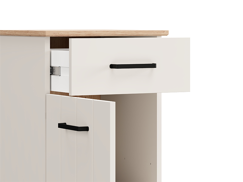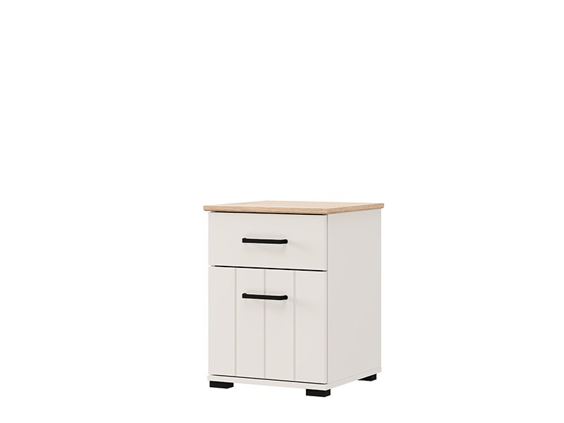 Der Nachttisch enthält eine Schublade und ein geschlossenes Fach und bietet somit einen praktischen und übersichtlichen Stauraum für Kleinigkeiten neben dem Bett.