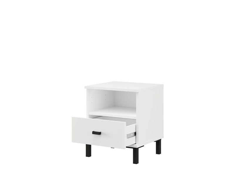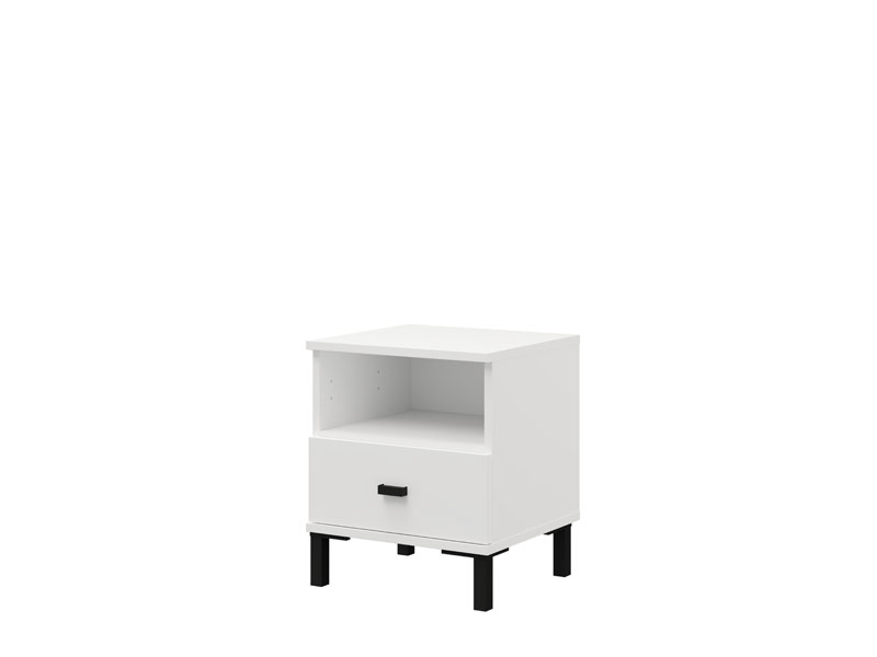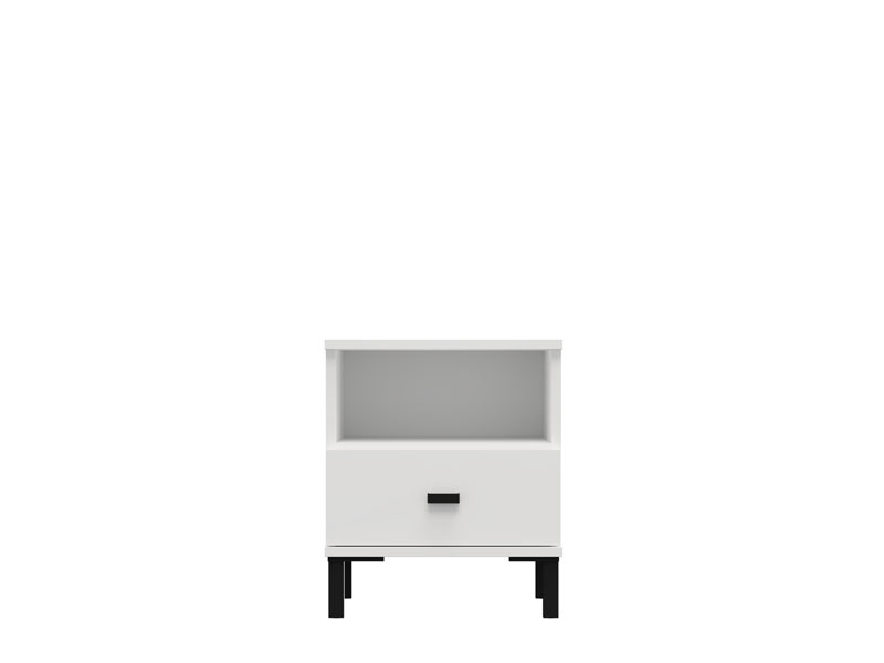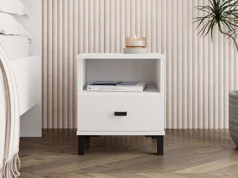 Der Nachttisch SALAMIS NO1F, ausgeführt in elegantem opak-weißem Dekor, trägt zu einem ruhigen und modernen Erscheinungsbild des Schlafzimmers bei und bietet gleichzeitig einen funktionalen und übersichtlichen Stauraum neben dem Bett.
