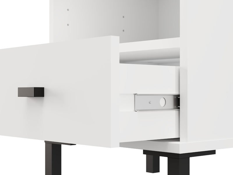 Der Stauraum des Nachttischs besteht aus einer Schublade und einem offenen Regal, die eine praktische Aufbewahrung von Kleinigkeiten und Alltagsgegenständen ermöglichen.
