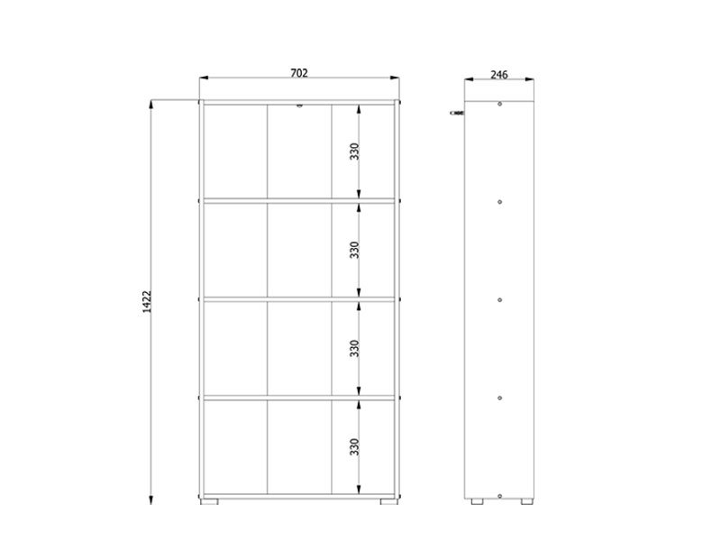 Das funktionale Modell des offenen Regals TOMAR 4 im grauen Eichendekor enthält vier separate Ablageflächen und passt sich sehr gut in verschiedene Arten von Innenräumen an.