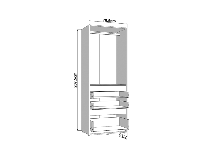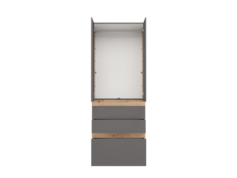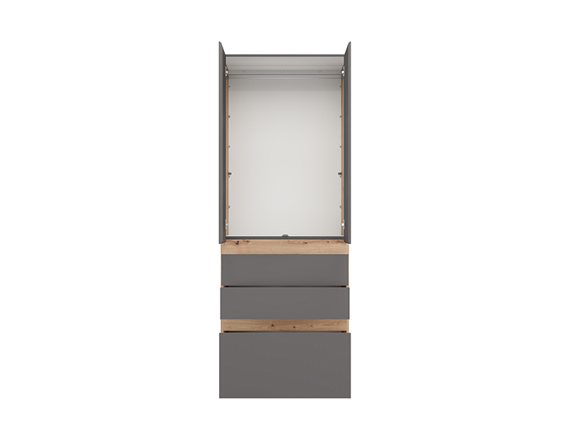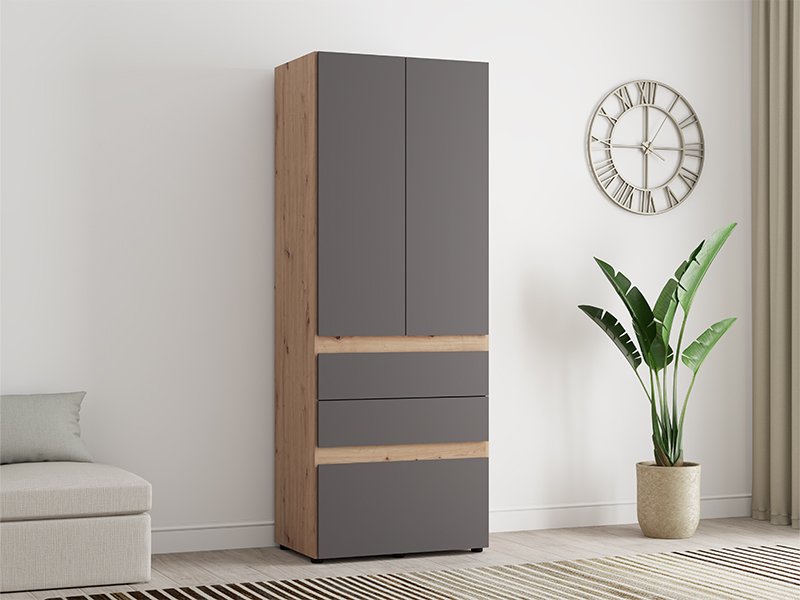 Der Schrank ARDERIN 2K3F h207 in der Kombination aus Artisan-Eiche und Grafit-Grau-Dekor stellt eine elegante und moderne Lösung zur Kleiderorganisation dar. Der Stauraum umfasst einen zweiflügeligen Bereich mit einer Kleiderstange, unter der sich drei Schubladen befinden – zwei flachere und eine tiefere –, was eine übersichtliche und praktische Organisation von Kleidung und Accessoires ermöglicht. Der Schrank wurde ohne sichtbare Griffe gestaltet, wodurch ein anspruchsvolles und minimalistisches Erscheinungsbild betont wird.