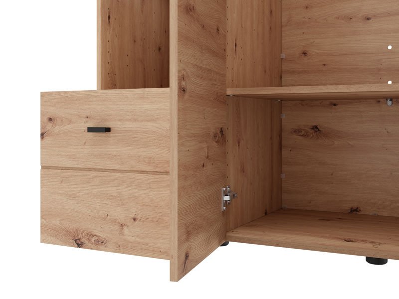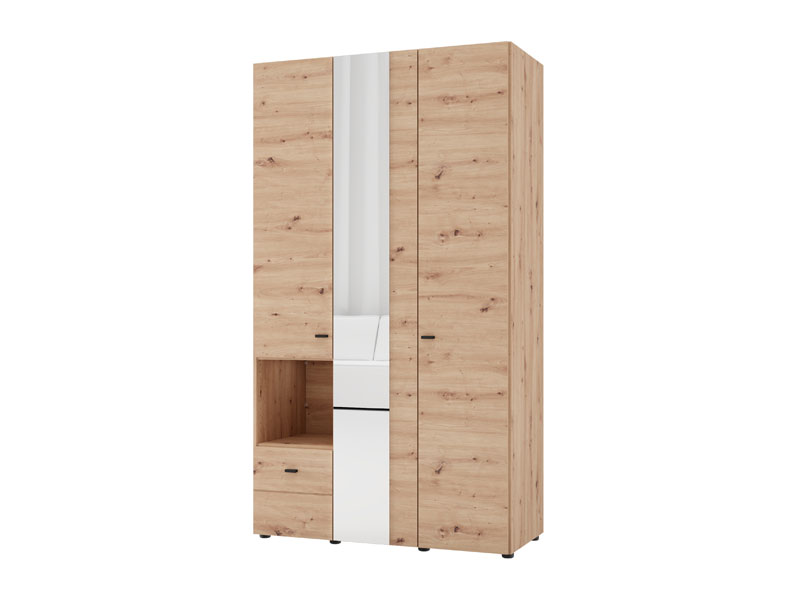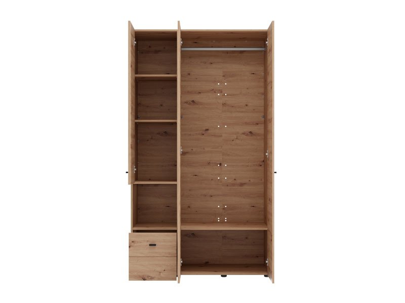 Der Schrank CAMPSIE 3K1F1O h207 im Artisan-Eiche-Dekor stellt eine moderne und elegante Lösung zur Kleiderorganisation dar. Dieser dreiflügelige Schrank verfügt über einen Flügel mit Spiegel, der Regalböden, ein offenes Regal und eine tiefe Schublade enthält, während der zweiflügelige Teil eine Kleiderstange umfasst und so eine übersichtliche und praktische Organisation von Kleidung und Accessoires ermöglicht. Der Stauraum lässt sich durch das Hinzufügen eines Regalsatzes erweitern, um zusätzliche Funktionalität zu bieten.
