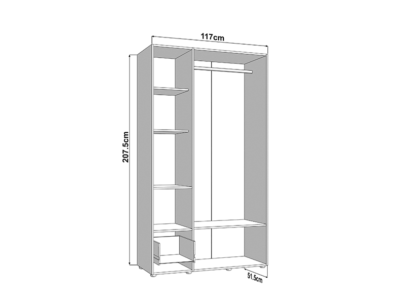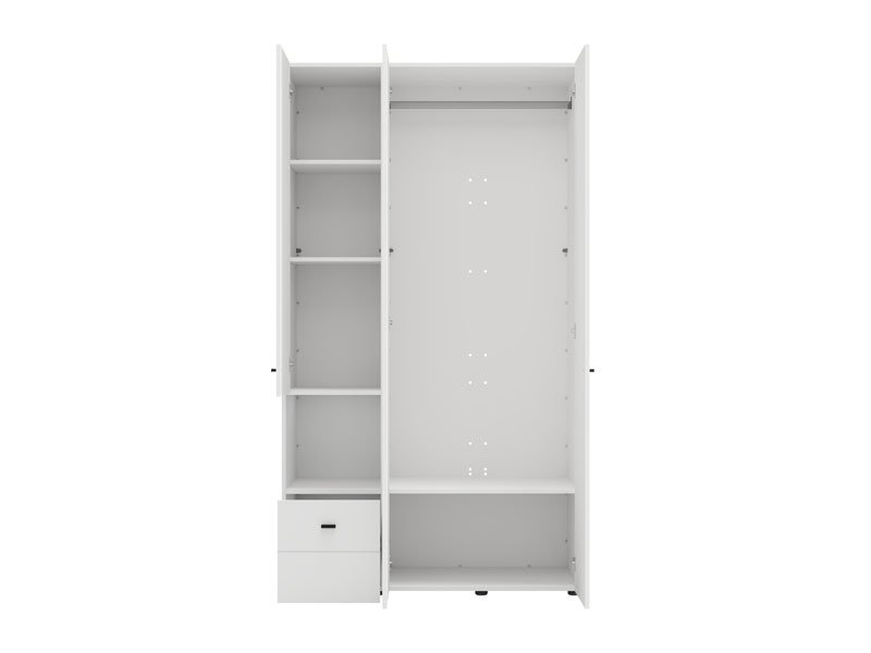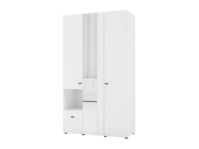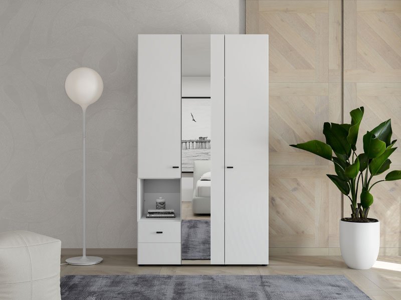 Der Schrank CAMPSIE 3K1F1O h207 im opak-weißen Dekor stellt eine moderne und elegante Lösung zur Kleiderorganisation dar. Dieser dreiflügelige Schrank verfügt über einen Flügel mit Spiegel, der Regalböden, ein offenes Regal und eine tiefe Schublade enthält, während der zweiflügelige Teil eine Kleiderstange umfasst und so eine übersichtliche und praktische Organisation von Kleidung und Accessoires ermöglicht. Der Stauraum lässt sich durch das Hinzufügen eines Regalsatzes erweitern, um zusätzliche Funktionalität zu bieten.
