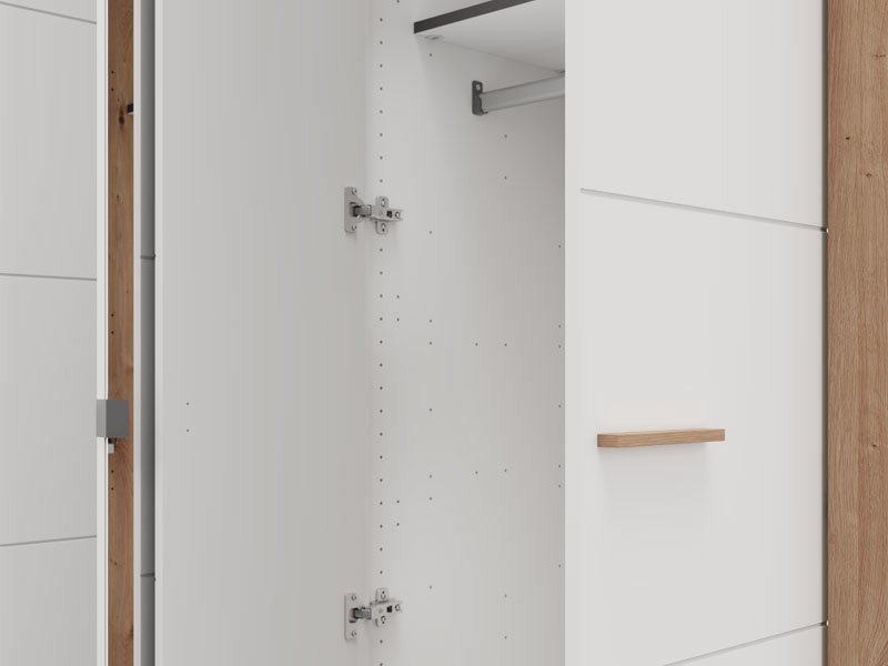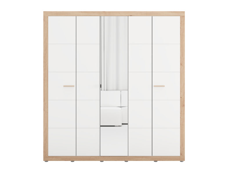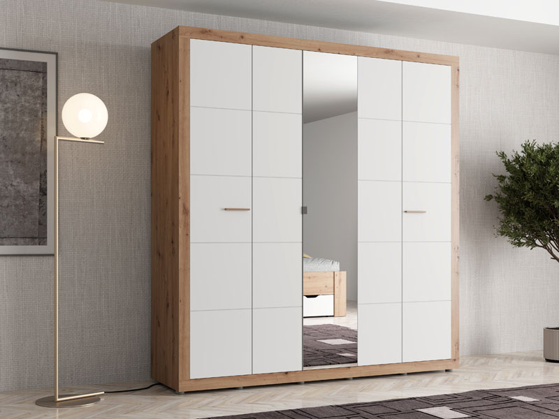 Der Schrank CARTENA 5K1O h207, ausgeführt in der Kombination aus opak-weißem Dekor, Artisan-Eiche-Dekor und Artisan-Eiche-Folie, verleiht dem Schlafzimmer ein modernes und elegantes Erscheinungsbild und betont den Materialkontrast sowie die präzise geometrische Designlinie. Die zentrale Front des Schrankes ist mit einem Spiegel ausgestattet, der die Funktionalität zusätzlich verbessert und den Raum visuell erweitert.