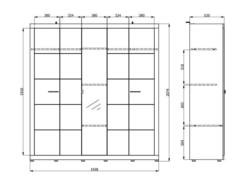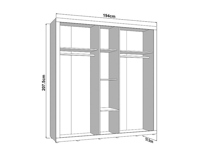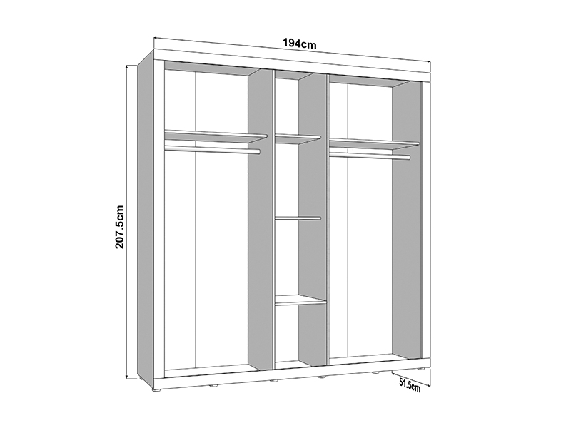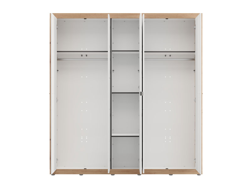 Der Stauraum des fünfflügeligen Schrankes ist so organisiert, dass zwei zweiflügelige Bereiche eine Kleiderstange enthalten, während der mittlere Teil mit Regalen ausgestattet ist, was eine übersichtliche und praktische Aufbewahrung der Garderobe ermöglicht.