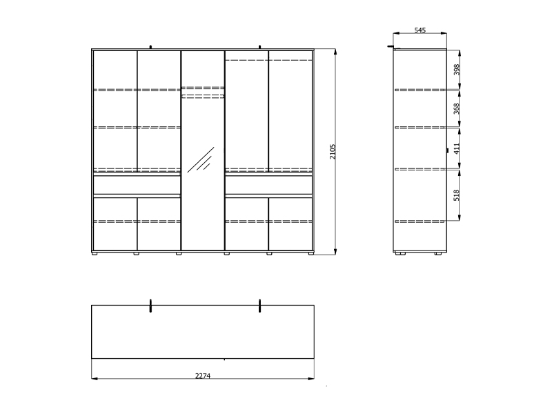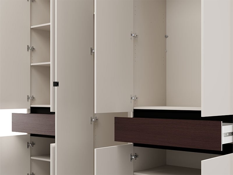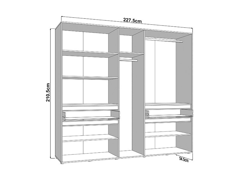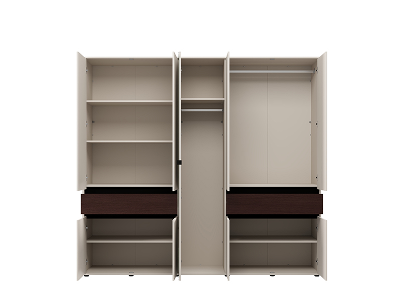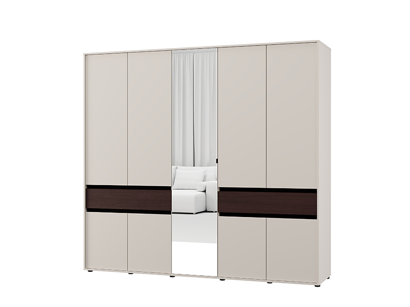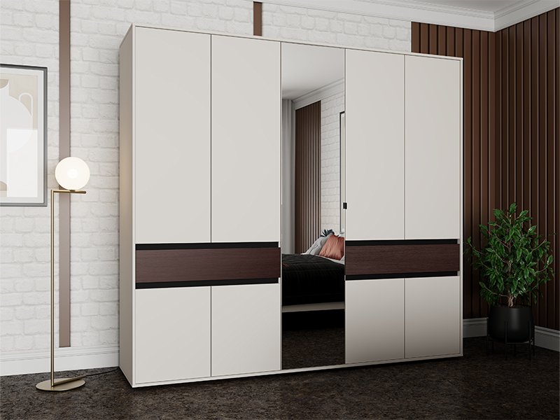 Dieser fünfflügelige Schrank verfügt über eine mittlere Front mit Spiegel, während der Stauraum aus Kleiderstangen und Fächern sowie zwei praktischen Schubladen besteht, was eine übersichtliche und funktionale Aufbewahrung von Kleidung und Kleinigkeiten ermöglicht.