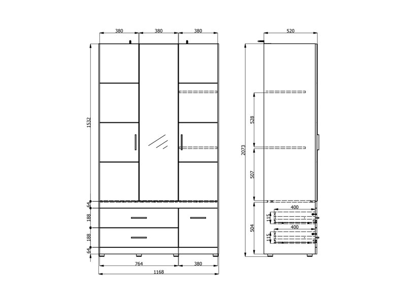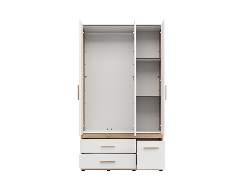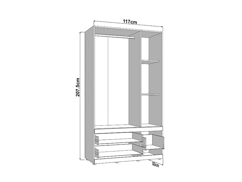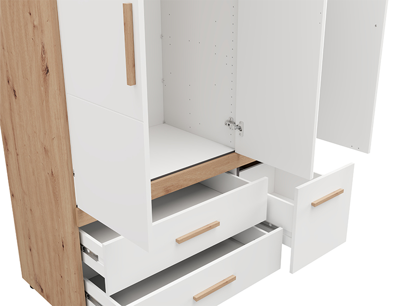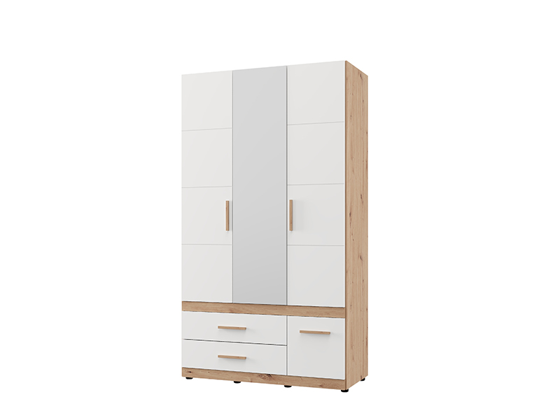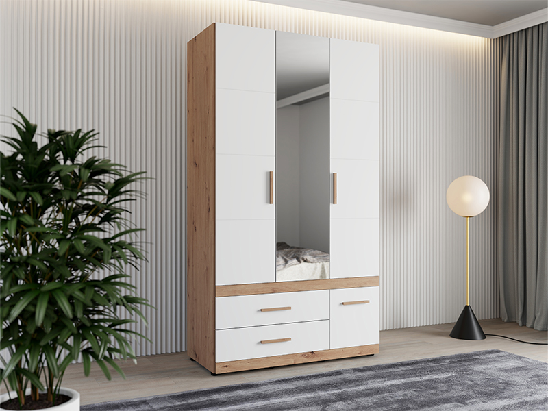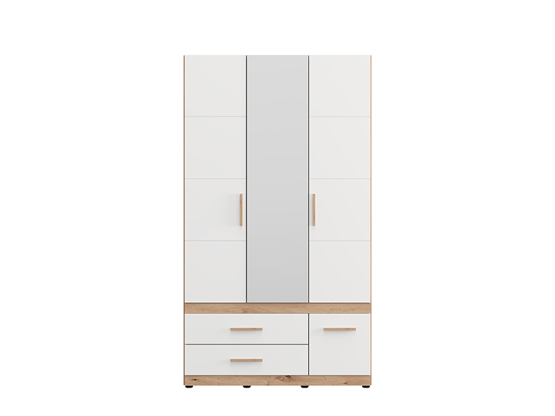 Der Schrank DILLON 3K3F1O h207 in der Kombination aus Artisan-Eiche und opak-weißem Dekor stellt eine funktionale und elegante Lösung zur Kleiderorganisation dar. Der dreiflügelige Schrank verfügt über einen zweiflügeligen Bereich mit einer Kleiderstange, unter dem sich zwei geräumige Schubladen befinden, während der einflügelige Bereich Regale sowie eine darunter befindliche tiefe Schublade umfasst. An der zentralen Front befindet sich ein Spiegel, der zur Praktikabilität und ästhetischen Raumwirkung beiträgt. Der Stauraum lässt sich durch das Hinzufügen eines Regalsatzes erweitern, um zusätzliche Funktionalität zu bieten.