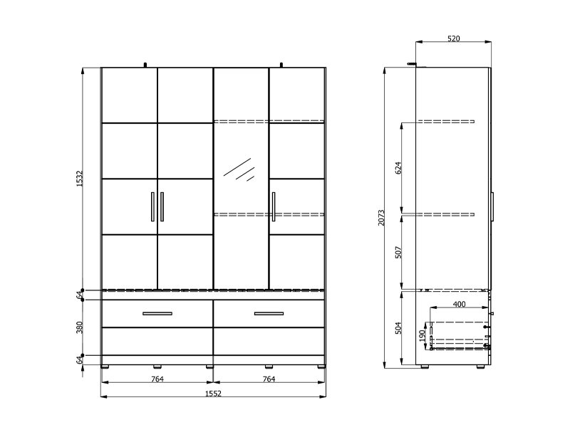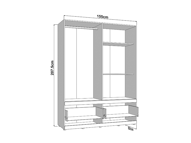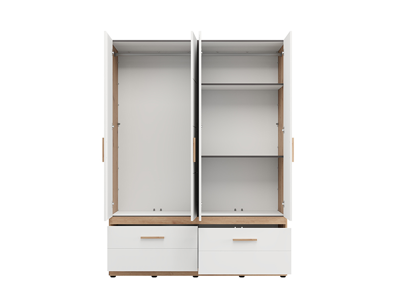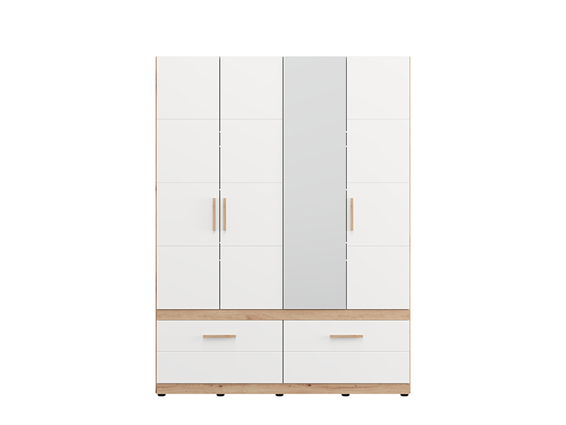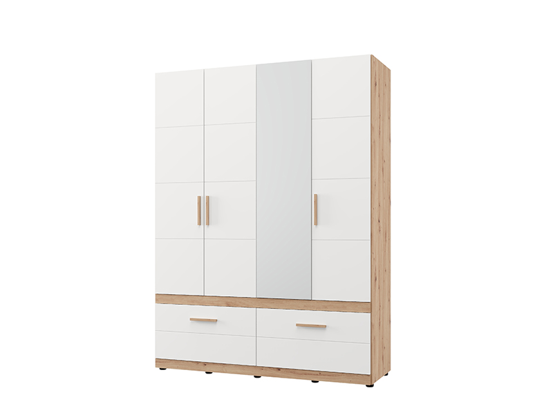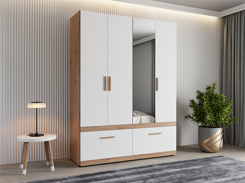 Der Schrank DILLON 4K2F1O h207 in der Kombination aus Artisan-Eiche und opak-weißem Dekor stellt eine funktionale und elegante Lösung zur Kleiderorganisation dar. Der Stauraum besteht aus zwei zweiflügligen Bereichen, von denen einer mit einer Kleiderstange und der andere mit Fächern ausgestattet ist. Unter den geschlossenen Teilen befinden sich zwei tiefe und geräumige Schubladen, die eine übersichtliche und praktische Organisation von Kleidung und Accessoires ermöglichen. An einer Front befindet sich ein Spiegel, der zur Praktikabilität und ästhetischen Raumwirkung beiträgt. Der Stauraum lässt sich durch das Hinzufügen eines Regalsatzes erweitern, um zusätzliche Funktionalität zu bieten.