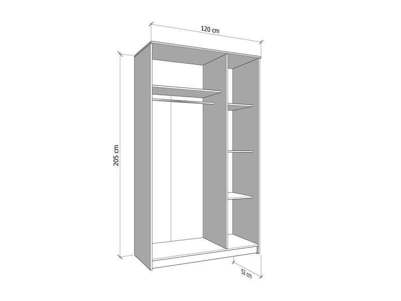Ein Modell des dreieckigen Schranks HANA 3K in weißer Farbe mit Garderobenstange und vier Regale ist zum Abstellen von Kleidung und Bettwäsche vorgesehen. Der Schrank HANA 3K wird die Bedürfnisse der ganzen Familie befriedigen.