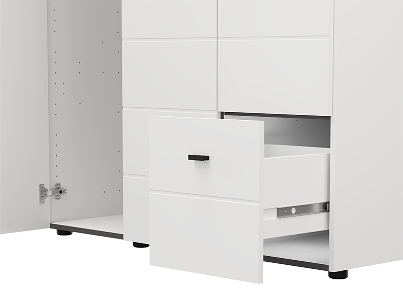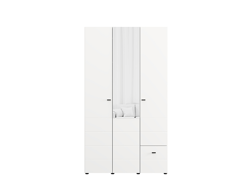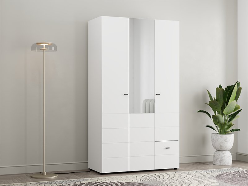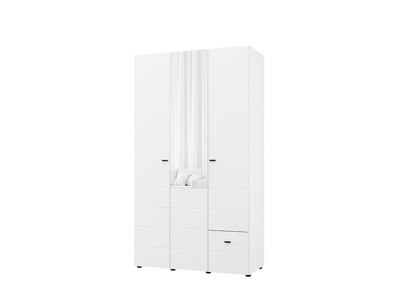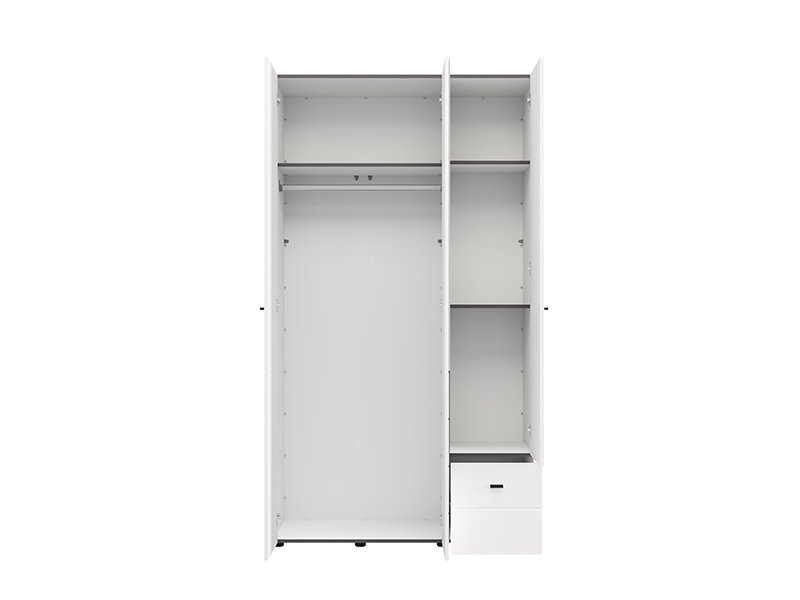 Der Schrank NEVIS 3K1F1O h207 im opak-weißen Dekor stellt eine funktionale und moderne Lösung zur Aufbewahrung von Kleidung dar. Der Stauraum umfasst einen zweiflügeligen Bereich mit Kleiderstange, ein Fachsegment sowie eine tiefe Schublade, was eine praktische und übersichtliche Organisation von Kleidung und Accessoires ermöglicht. Es besteht die Möglichkeit, den Innenraum durch zusätzliche Regalsätze zu ergänzen, um eine verbesserte Organisation zu gewährleisten. Der integrierte Spiegel steigert die Funktionalität und verleiht dem Raum eine optisch ansprechende Gestaltung. Der Schrank NEVIS 3K1F1O h207 ist Teil der Schrankkollektion NEVIS und lässt sich mit weiteren Modellen dieser Linie kombinieren.