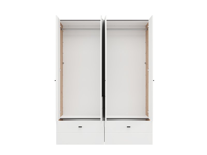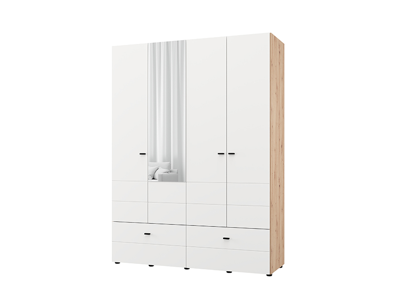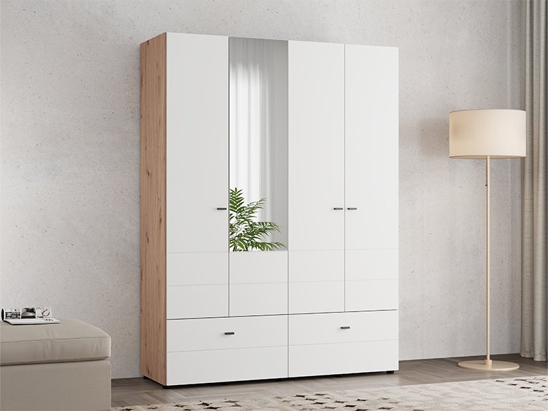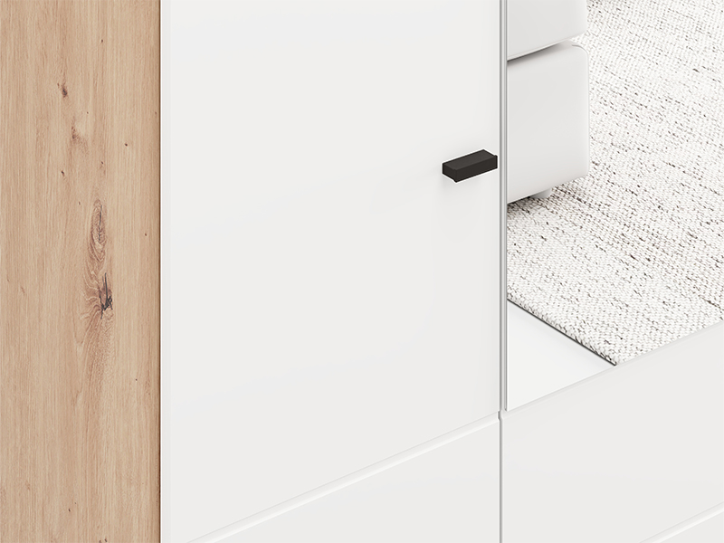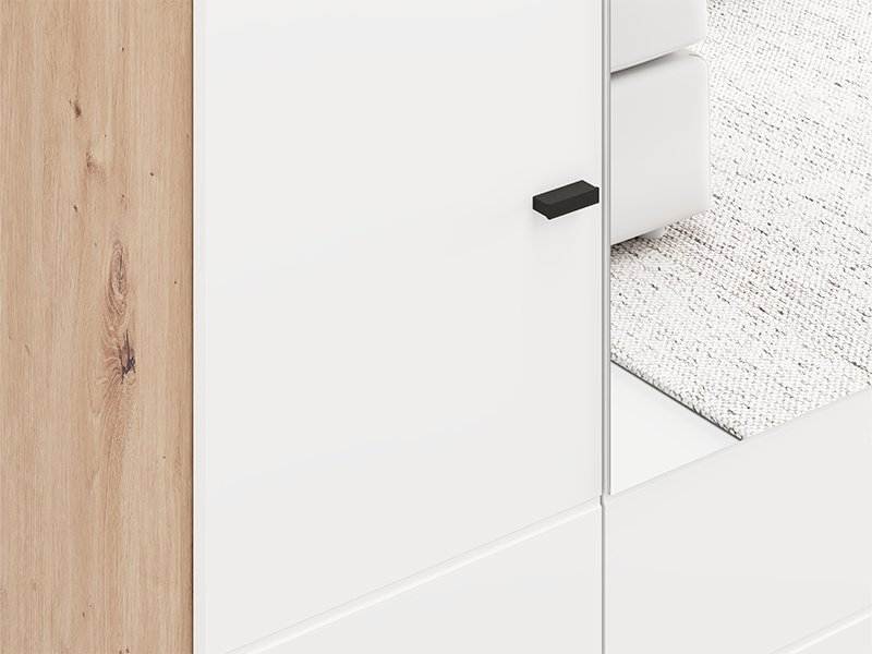 Der Schrank NEVIS 4K2F1O h207 in der Kombination aus Artisan-Eiche und opak-weißem Dekor stellt eine funktionale und moderne Lösung zur Kleiderorganisation dar. Der Stauraum umfasst einen zweiflügeligen Bereich mit Kleiderstange, einen zweiflügeligen Bereich mit Fächern und zwei geräumige, tiefe Schubladen, was eine übersichtliche und praktische Organisation von Kleidung und Accessoires ermöglicht. Der integrierte Spiegel steigert die Funktionalität und verleiht dem Raum eine optisch ansprechende Gestaltung. Es besteht die Möglichkeit, den Innenraum durch zusätzliche Regalsätze zu ergänzen, um eine verbesserte Organisation zu gewährleisten. Der Schrank NEVIS 4K2F1O h207 ist Teil der Schrankkollektion NEVIS und lässt sich mit weiteren Modellen dieser Linie kombinieren.