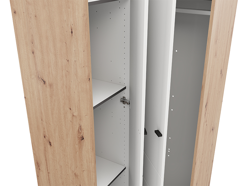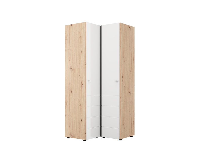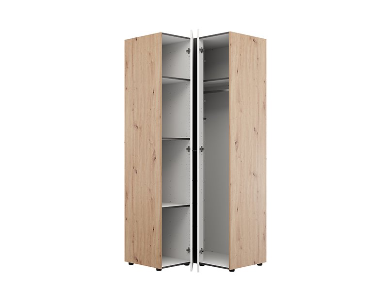 Der Schrank NEVIS UG h207 in der Kombination aus Artisan-Eiche und opak-weißem Dekor stellt eine funktionale und moderne Lösung zur vollständigen Raumnutzung dar. Das Eckdesign ermöglicht eine optimale Organisation von Kleidung und Accessoires – eine Seite des Schranks ist mit einer Kleiderstange ausgestattet, während die andere Seite Fächer aufweist, die einen praktischen und übersichtlichen Stauraum gewährleisten. Der Schrank NEVIS UG h207 ist Teil der Schrankkollektion NEVIS und lässt sich mit weiteren Modellen dieser Linie kombinieren.