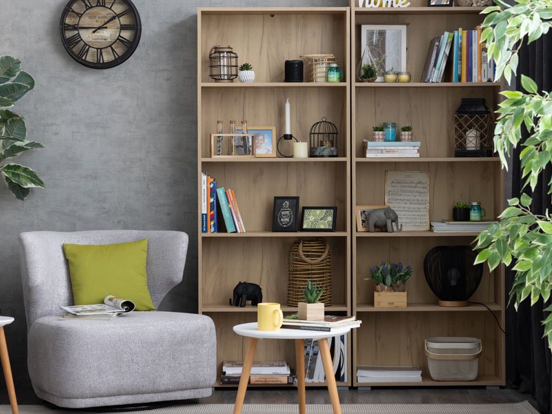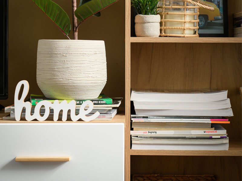 Das funktionale Modell des offenen Regals TOMAR 5 in Artisan Eiche-Dekor enthält fünf separate Ablageflächen und passt sich sehr gut in verschiedene Arten von Innenräumen an.