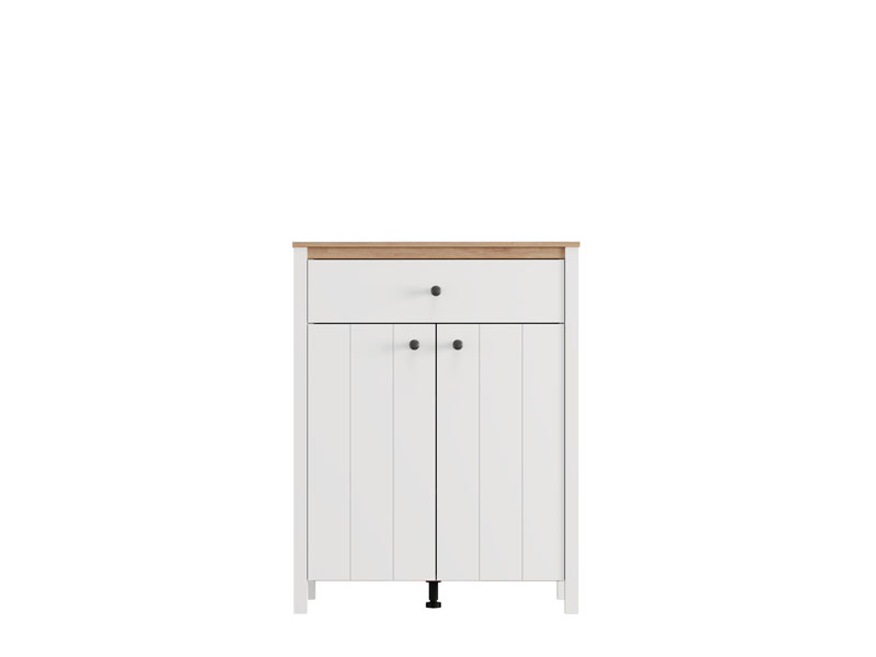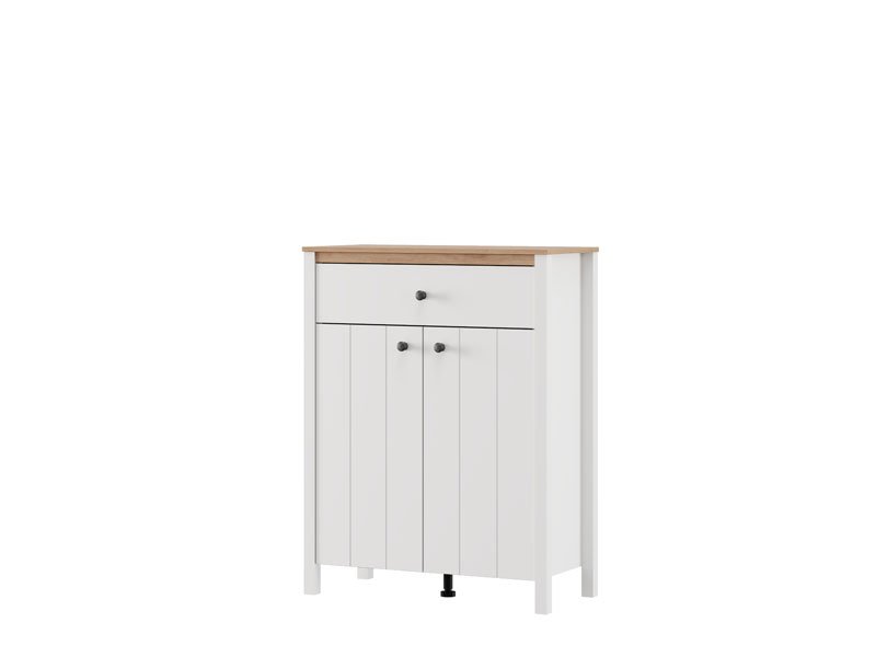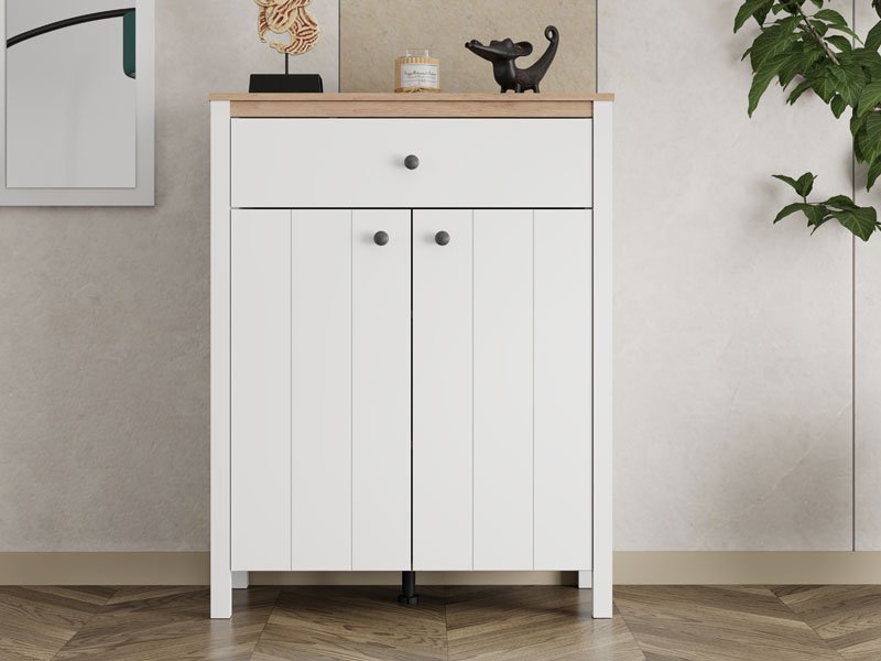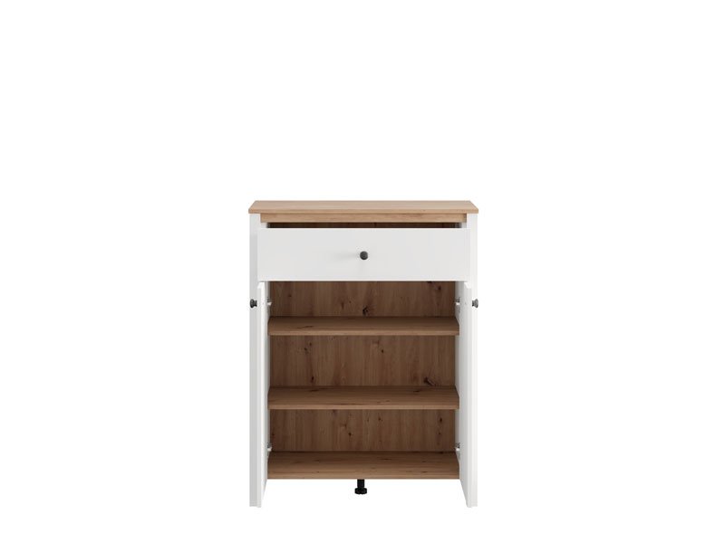 Das Eingangsbereichelement BEDFORD 2K1F2V kombiniert opak-weißes Dekor, Artisan-Eiche, weiße Mattfolie und Artisan-Eiche-Folie und stellt einen zweiflügeligen, geschlossenen Aufbewahrungsbereich sowie eine Schublade für kleinere Gegenstände bereit. Dieses Element lässt sich mit weiteren Elementen der BEDFORD-Kollektion kombinieren und ermöglicht dadurch eine funktionale sowie harmonische Organisation des Eingangsbereichs.