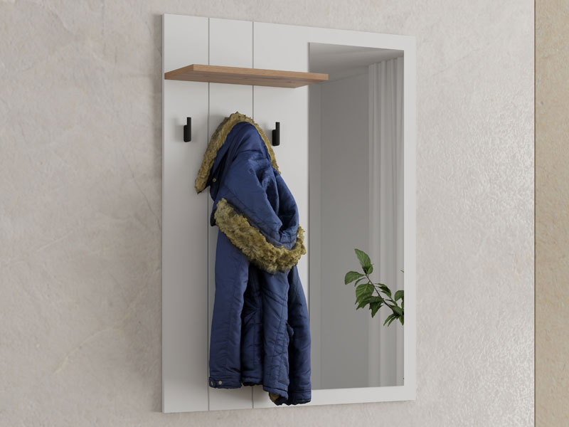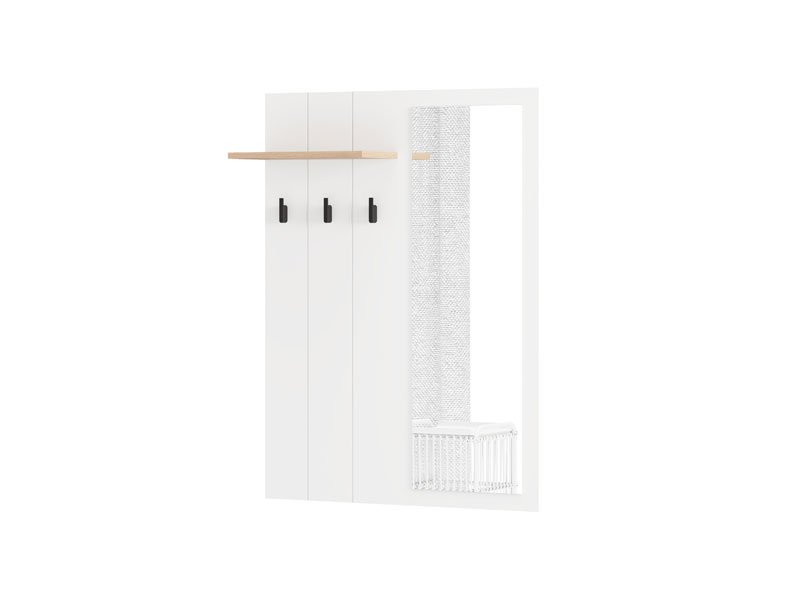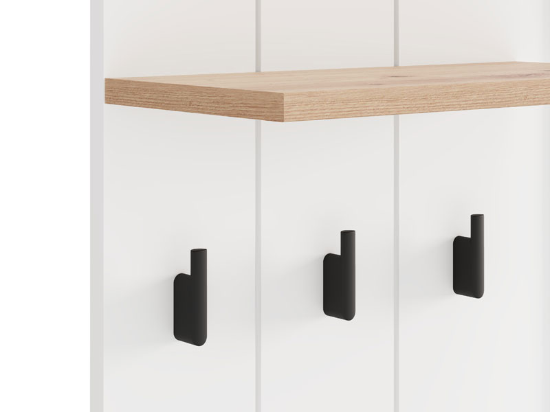 Das Eingangsbereichelement BEDFORD CIV OG kombiniert opak-weißes Dekor, Artisan-Eiche, weiße Mattfolie und Artisan-Eiche-Folie und stellt eine praktische und funktionale Lösung für den Eingangsbereich dar. Das Element verfügt über einen Kleiderständer zur Aufbewahrung von Kleidung sowie einen Spiegel, der den Raum optisch vergrößert und zur Helligkeit des Eingangsbereichs beiträgt. Dieses Element lässt sich mit weiteren Elementen der BEDFORD-Kollektion kombinieren und erzeugt dadurch eine harmonische sowie stilvolle Einheit für den Eingangsbereich.