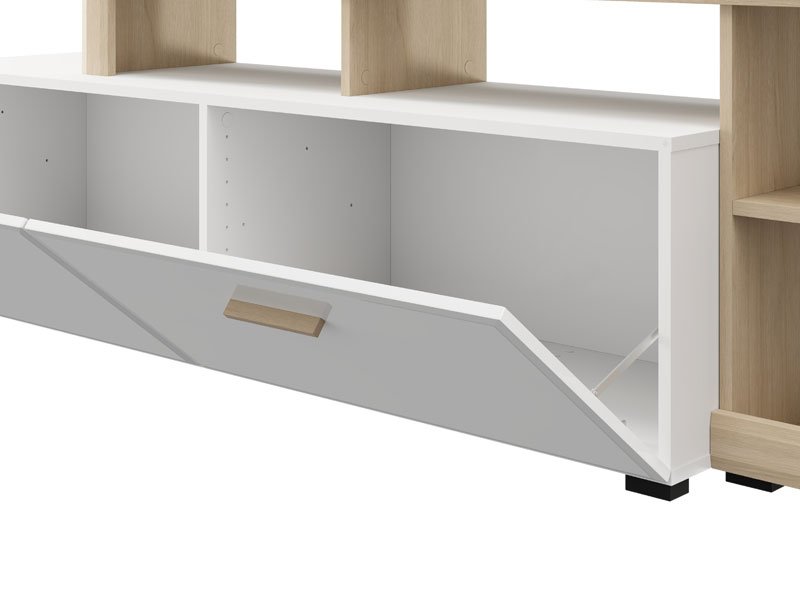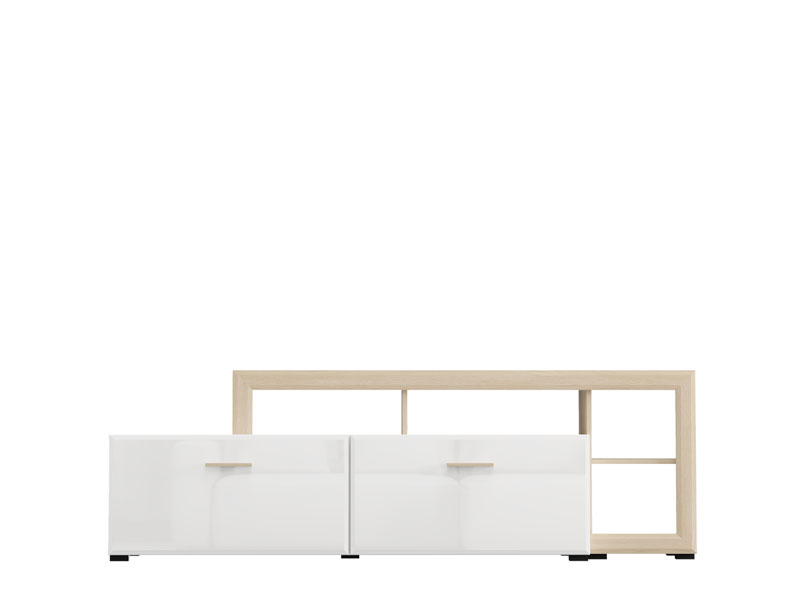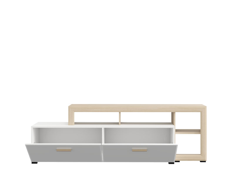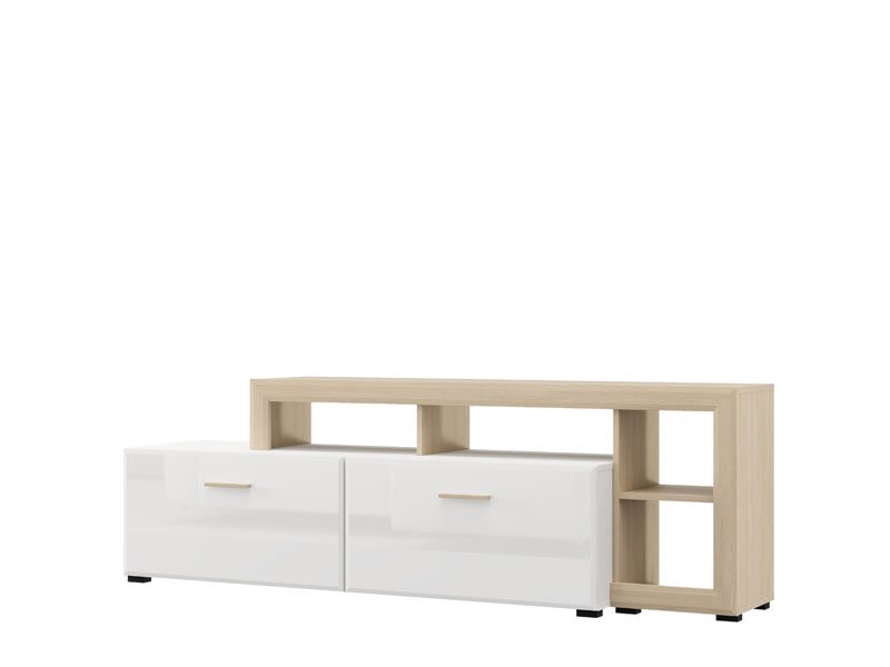 Das Fernsehregal CARLOW TV 189 2K2V OP ist ein funktionales und ästhetisch ansprechendes Element zur Einrichtung Ihres Wohnzimmers. Die Kombination aus opak-weißen Dekor, heller Port-Eiche, weißer Hochglanzfolie und heller Port-Eiche-Folie verleiht dem Raum ein Gefühl von Modernität, Wärme und visueller Ausgewogenheit, wodurch sich dieses Element problemlos in verschiedene Einrichtungskonzepte integrieren lässt. Zwei geschlossene Fächer und attraktiv platzierte offene Regale ermöglichen eine praktische Organisation von Multimedia-Geräten und Dekorationsdetails und sorgen für ein harmonisches und übersichtliches Erscheinungsbild. Das Fernsehregal ist Teil des CARLOW-Elementsystems zur Wohnzimmereinrichtung, welches eine moderne und ganzheitliche Lösung für die stilvolle Gestaltung Ihres Wohnambientes darstellt.