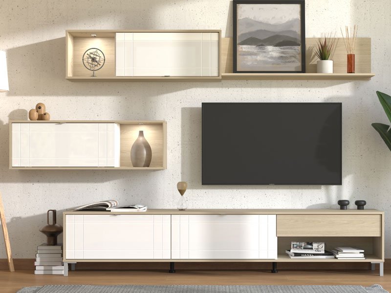 Das Regal CAMBRIDGE in der Kombination aus Opak-Weißem Dekor und Dekor in heller Port-Eiche ist eine moderne und funktionale Lösung zur Gestaltung des Wohnbereichs. Dieses Regal besteht aus vier flexibel anordnenden Segmenten, wobei zwei Wandteile wahlweise horizontal oder vertikal montiert werden können. Drei der vier Regalelemente verfügen über offene Regale und geschlossene Abteile. Dank der guten Aufteilung des Stauraums und des Designs fügt es sich problemlos in moderne Wohnumgebungen ein. Das Regal lässt sich optional mit integrierter Beleuchtung ausstatten.