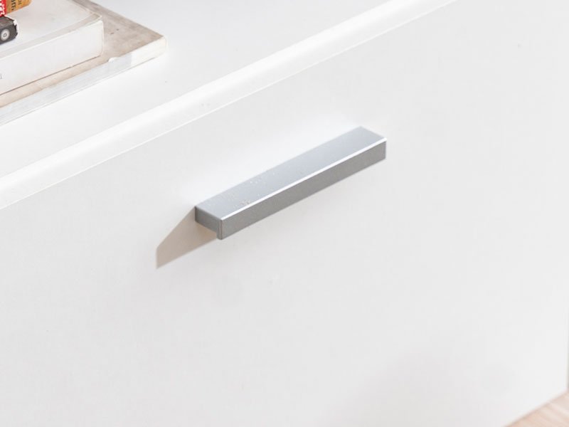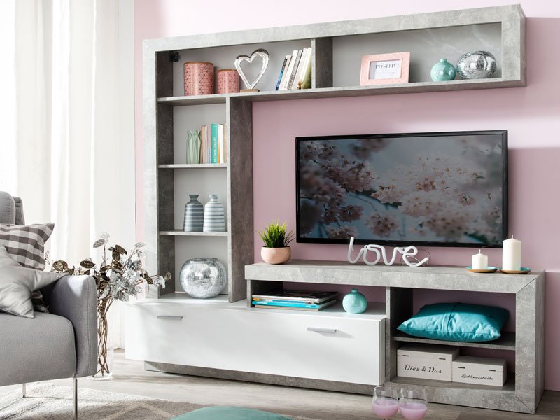 Das Regal GLEN, in der Kombination des opak weißen und Beton-Dekors zeigt die Übereinstimmung von Form und Funktion, sowie ein auffälliges Design, das für die moderne Erfrischung bei der Einrichtung des des Wohnzimmers darstellt. Der geschlossene Teil, das zentral positionierte TV Regal und die offenen Segmente formen ein kompaktes Ganzes zur Aufbewahrung Ihrer kostbaren Kleinigkeiten und audiovisuellen Geräten.