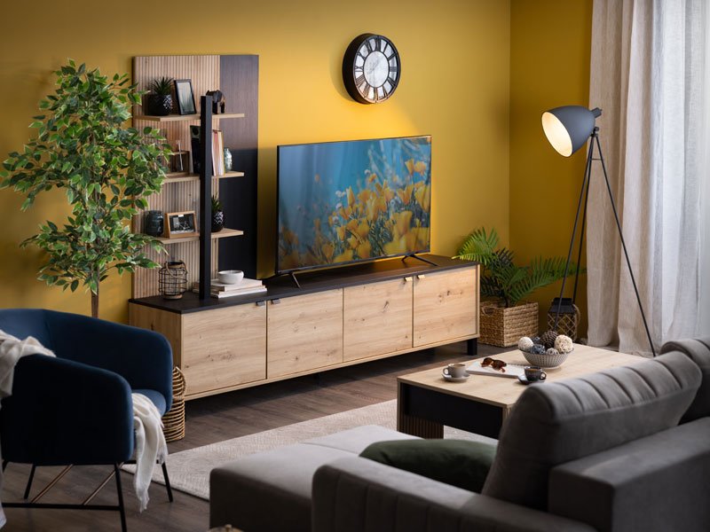 Das Regal MARGATE in der Kombination aus Artisan-Eiche-Dekor, Schwarz-Eiche-Dekor und Artisan-Eiche mit Streifen ist eine moderne und funktionale Lösung zur Gestaltung des Wohnbereichs. Es verfügt über drei offene Regale sowie vier Regale im unterteilten, geschlossenen Bereich. Dank der guten Aufteilung des Stauraums und des Designs fügt es sich problemlos in moderne Wohnumgebungen ein.