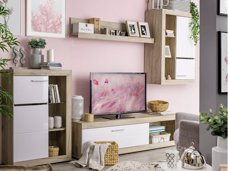 Das Regal ROSSO, im Dekor der grauen Eiche, mit Fronts beschichtet mit der schwarzen 3D MDF matt Folie, designiert, um funktionale und ästhetische Anforderungen in der Einrichtung jeder Umgebung. Das Regal ROSSO ermöglicht komplette Austattung des Wohnzimmers, dank der sehr praktischen Anordnung der offenen und geschlossenen Regale. Es besteht die Möglichkeit der Hinzufügung der LED Beleuchtung.