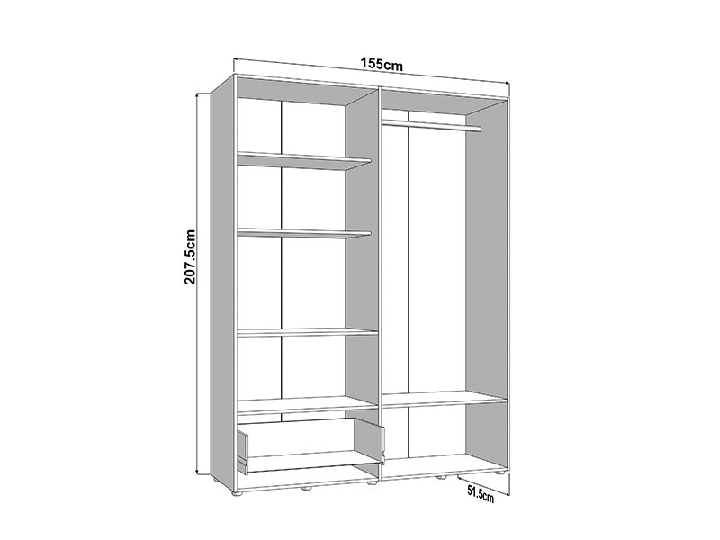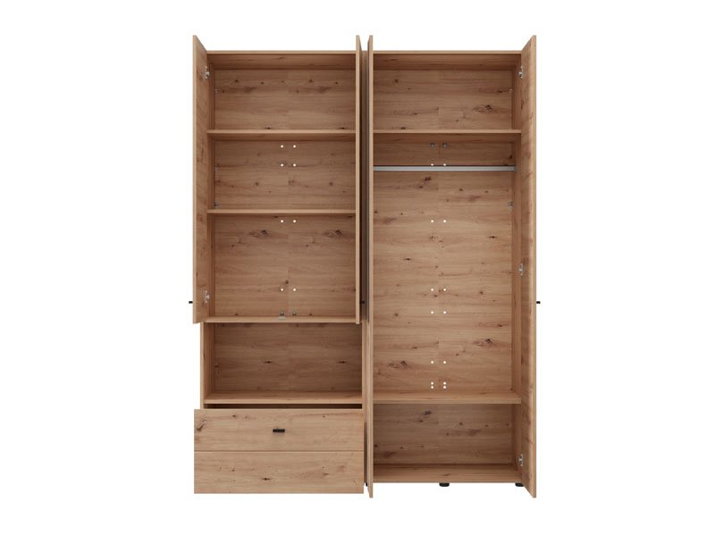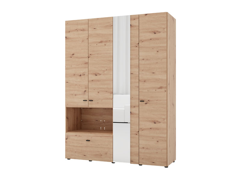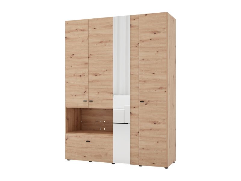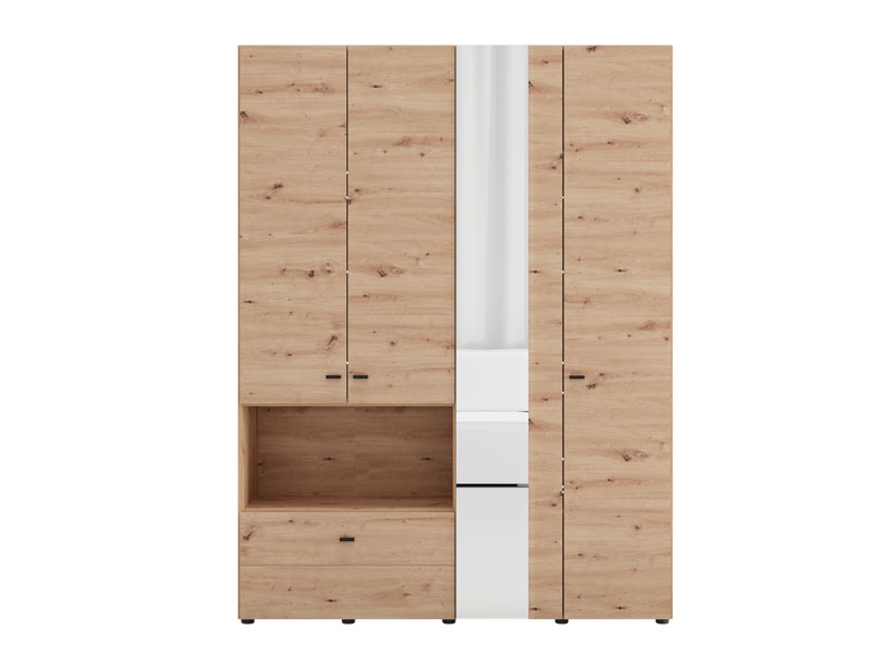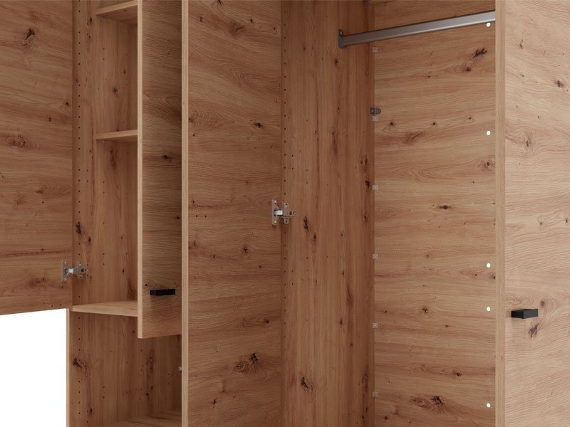 Der Schrank CAMPSIE 4K1F1O h207 im Artisan-Eiche-Dekor stellt eine moderne und elegante Lösung zur Kleiderorganisation dar. Dieser vierflügelige Schrank besitzt einen zweiflügeligen Bereich mit Regalen, einem offenen Regal und einer tiefen Schublade, während der andere zweiflügelige Bereich mit einer Kleiderstange ausgestattet ist. Ein Flügel des Schrankes ist mit Spiegel ausgestattet, was sowohl praktische Vorteile bietet als auch die Raumwirkung ästhetisch aufwertet. Der Stauraum lässt sich durch das Hinzufügen eines Regalsatzes erweitern, um die Funktionalität des Innenraums zu erhöhen.