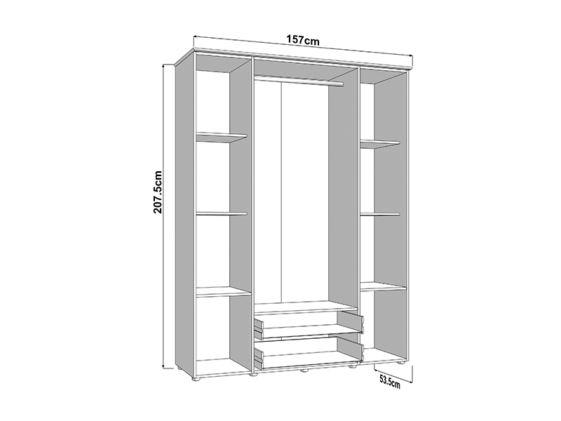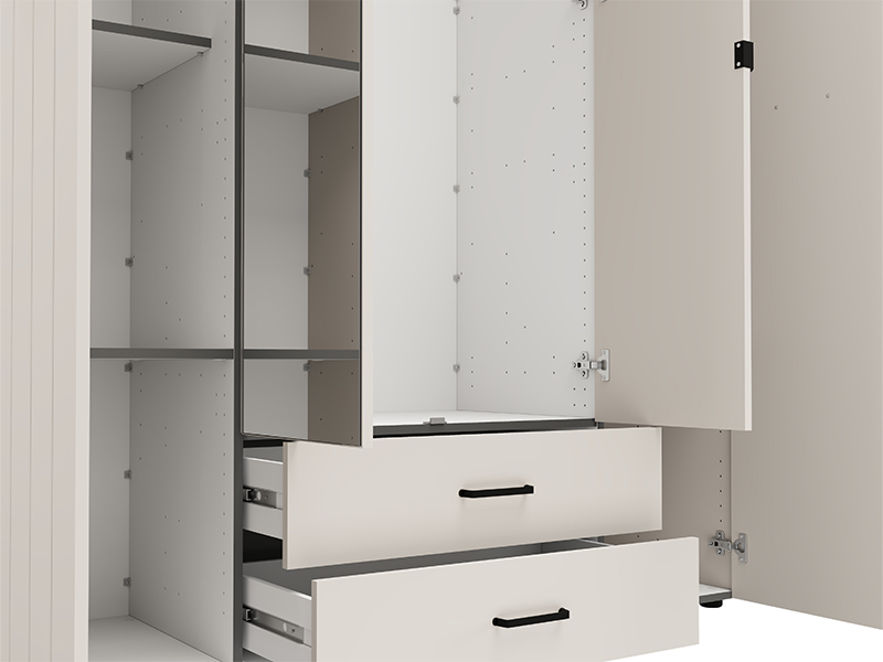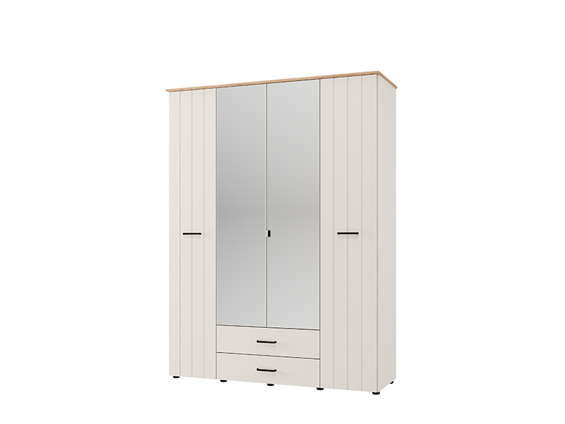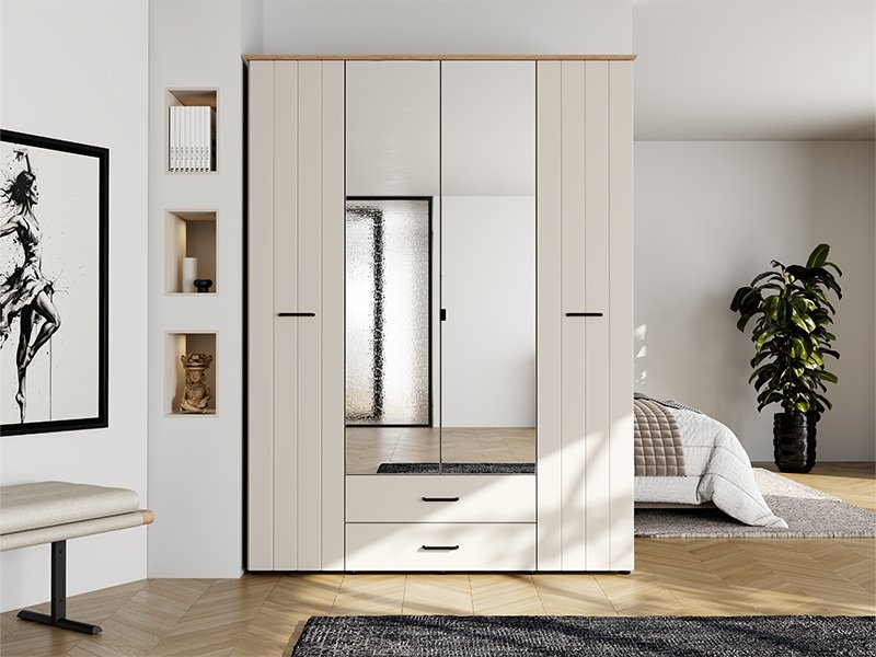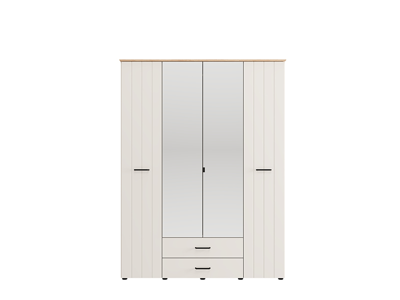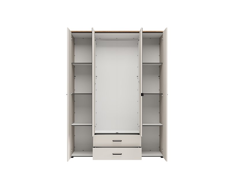 Der vierflügelige Schrank LAMBETH 4K2F2O h207 ist so organisiert, dass die mittleren Fronten mit Spiegeln ausgestattet sind und der Stauraum in diesem Bereich eine Kleiderstange sowie zwei darunter liegende Schubladen enthält, was eine übersichtliche und praktische Aufbewahrung von Kleidung und kleineren Gegenständen ermöglicht. Die linke und rechte Abteilung bieten zusätzlichen Stauraum für die Organisation von Garderobe und anderen Gegenständen. Der Schrank bietet zudem die Möglichkeit, nachträglich einen Satz Regale hinzuzufügen, wodurch die Funktionalität des Innenraums weiter verbessert wird.