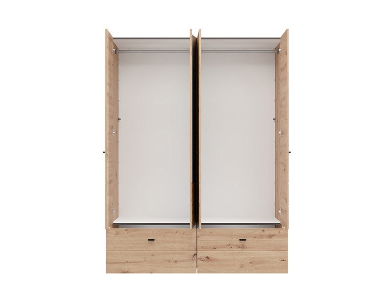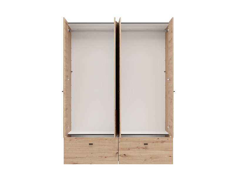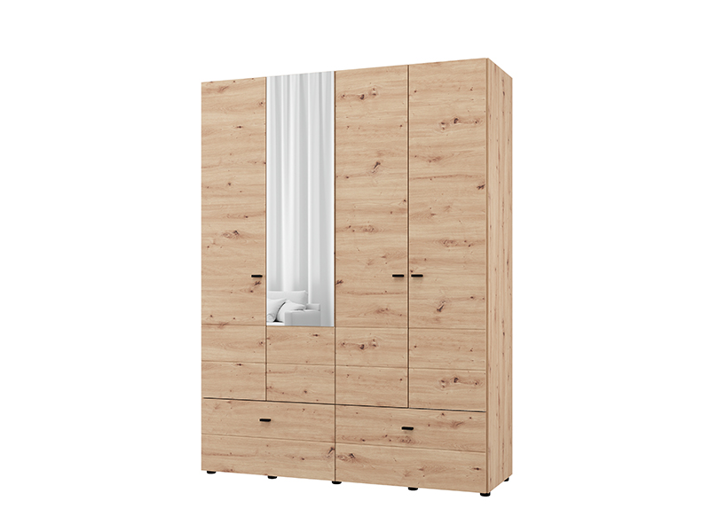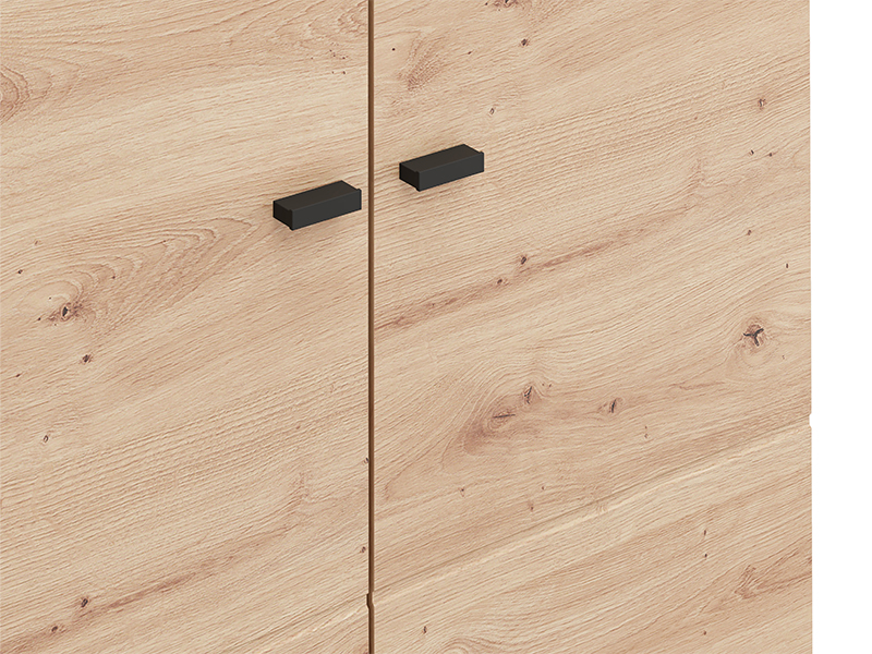 Der Schrank NEVIS 4K2F1O h207 im Artisan-Eiche-Dekor stellt eine funktionale und moderne Lösung zur Kleiderorganisation dar. Der Stauraum umfasst einen zweiflügeligen Bereich mit Kleiderstange, einen zweiflügeligen Bereich mit Fächern und zwei geräumige, tiefe Schubladen, was eine übersichtliche und praktische Organisation von Kleidung und Accessoires ermöglicht. Der integrierte Spiegel steigert die Funktionalität und verleiht dem Raum eine optisch ansprechende Gestaltung. Es besteht die Möglichkeit, den Innenraum durch zusätzliche Regalsätze zu ergänzen, um eine verbesserte Organisation zu gewährleisten. Der Schrank NEVIS 4K2F1O h207 ist Teil der Schrankkollektion NEVIS und lässt sich mit weiteren Modellen dieser Linie kombinieren.