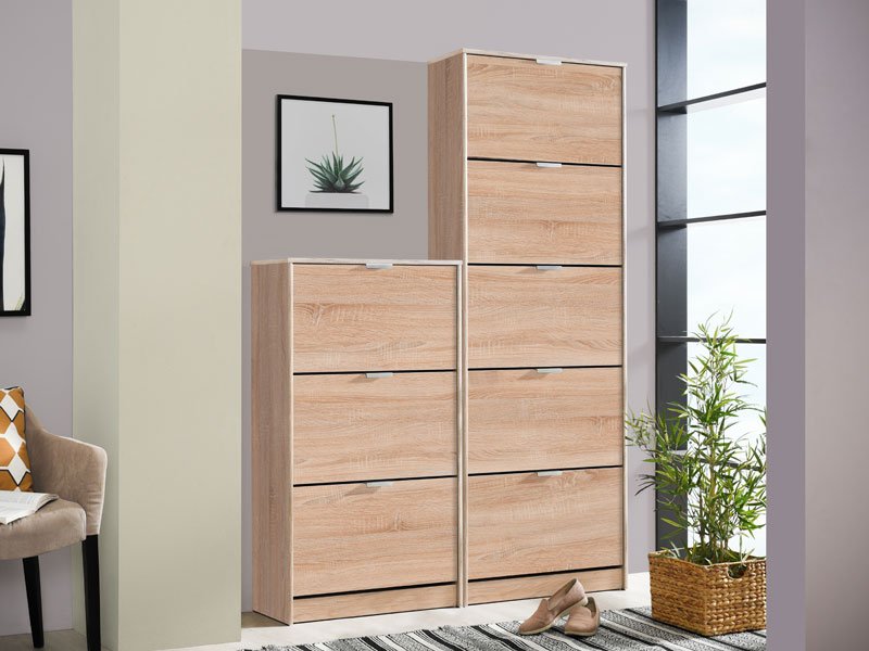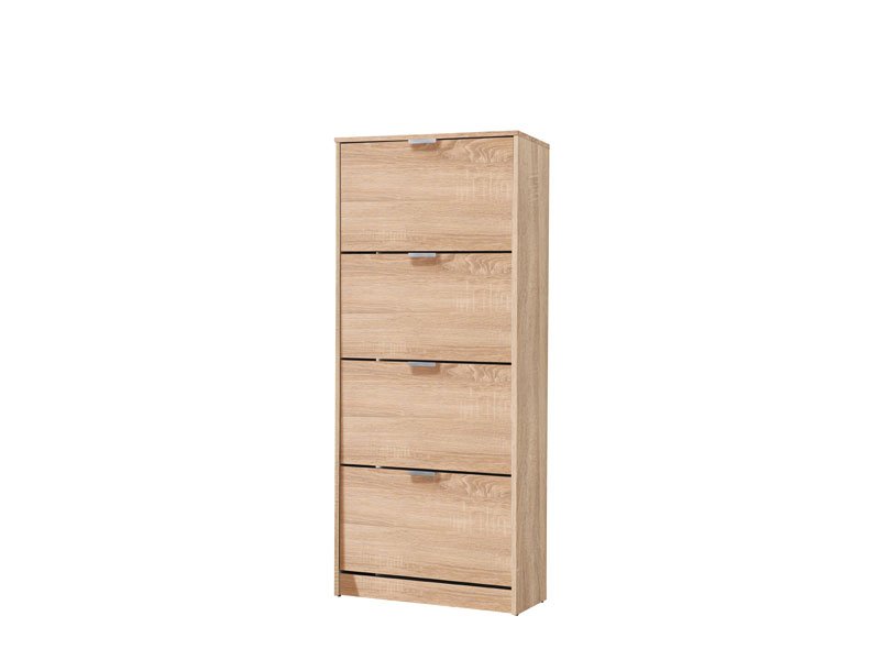Der Schuhschrank HUGO 24, in Sonoma Eichendekor, hat vier Segmente für saisonale Lagerung der Schuhe und dank seiner Abmessungen und zweizeiligen Organisation, ist eine sehr effektive funktionelle Lösung für die Einrichtung eines kleineren Vorzimmers.