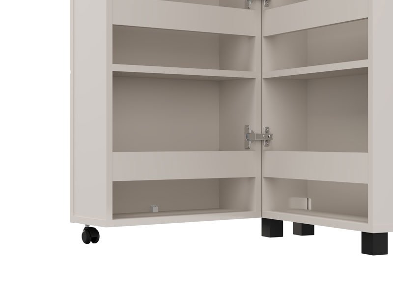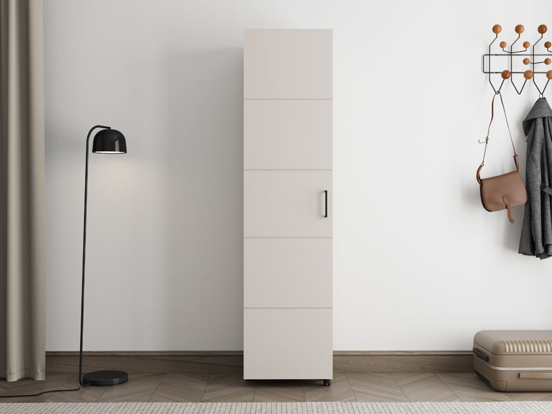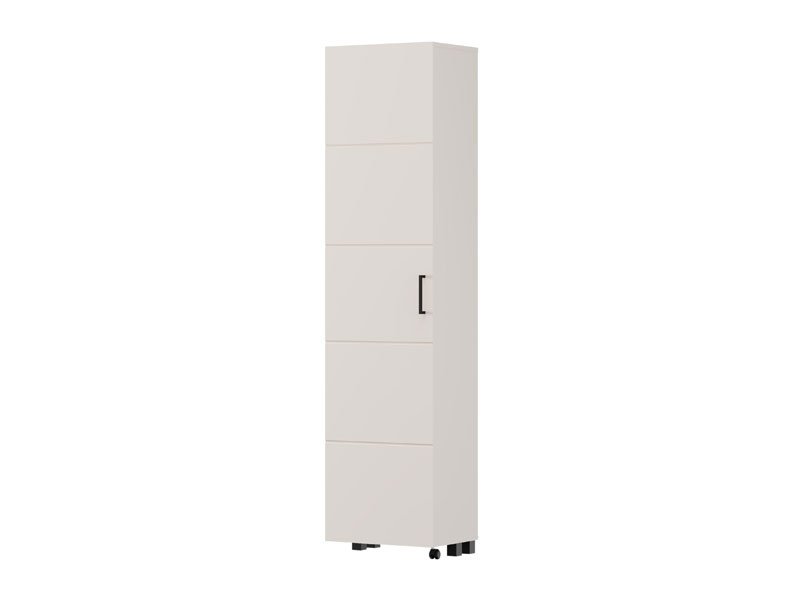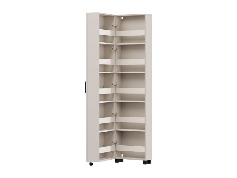 Der Schuhschrank ISLAY 46 1K h185 im Kaschmir-Dekor mit einer Heißprägung von Rillen stellt eine praktische und elegante Lösung für den Flur dar. Das Innere dieses einflügeligen Schuhschranks mit geschlossenen Regalen ermöglicht eine übersichtliche und funktionale Organisation von Schuhen.