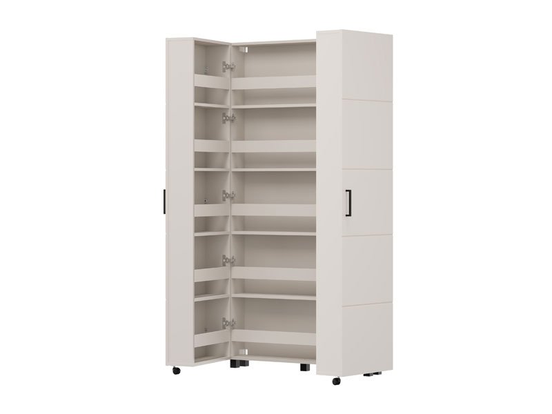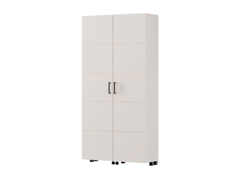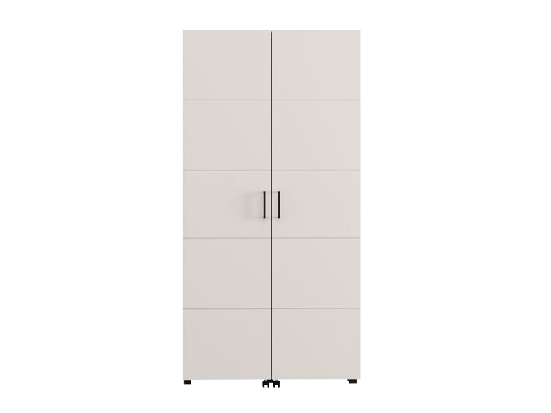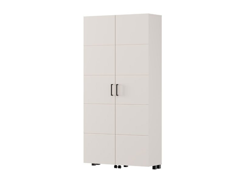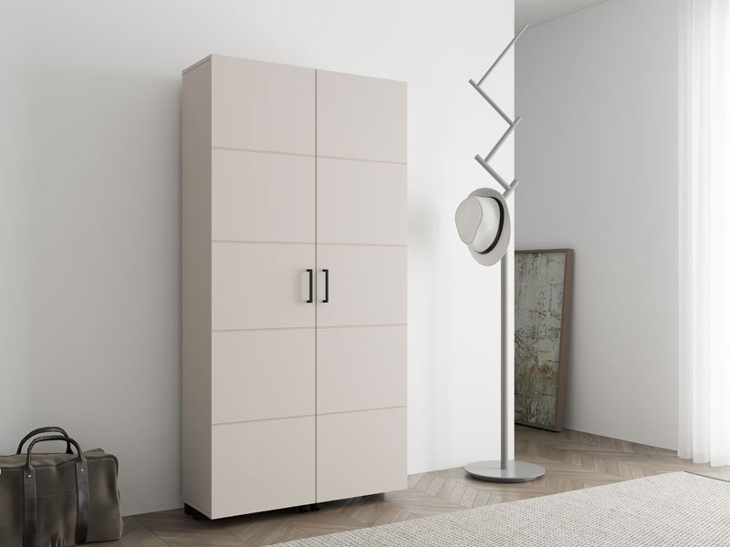Der Schuhschrank ISLAY 91 2K h185 im Kaschmir-Dekor mit einer Heißprägung von Rillen auf der Front stellt eine praktische und elegante Lösung für den Flur dar. Das Innere dieses zweiflügeligen Schuhschranks mit geschlossenen Regalen ermöglicht eine funktionale und übersichtliche Organisation von Schuhen.