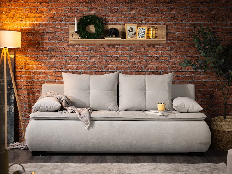 Der genaue Name des Musters: Sitzfläche/Rückenlehne/Großkissen/Kleinkissen – Stoff Wind 80 Beige. Das Sofa MINA vereint modernes Design und Stoff mit hochfunktionalen Eigenschaften und erfüllt alle Anforderungen an einen modernen Wohnraum. Eine Aufbewahrungsbox für Bettwäsche steigert die Funktionalität, während die nutzbare Fläche zum Ausruhen und Schlafen (150x200 cm) zusätzlichen Komfort bieten.