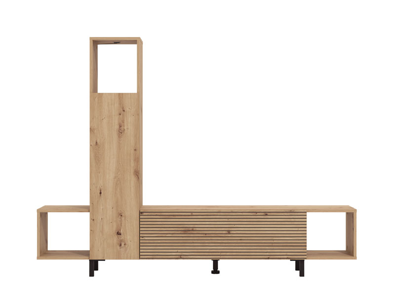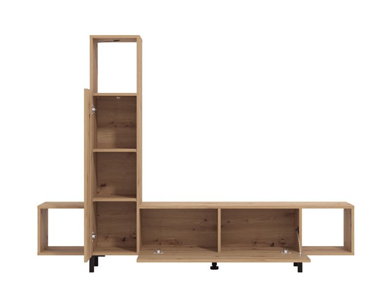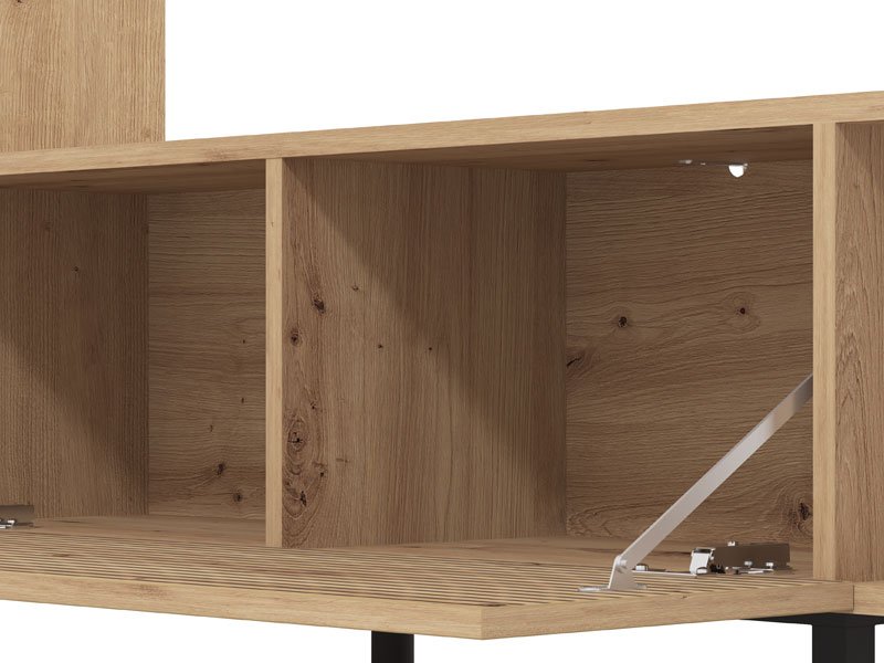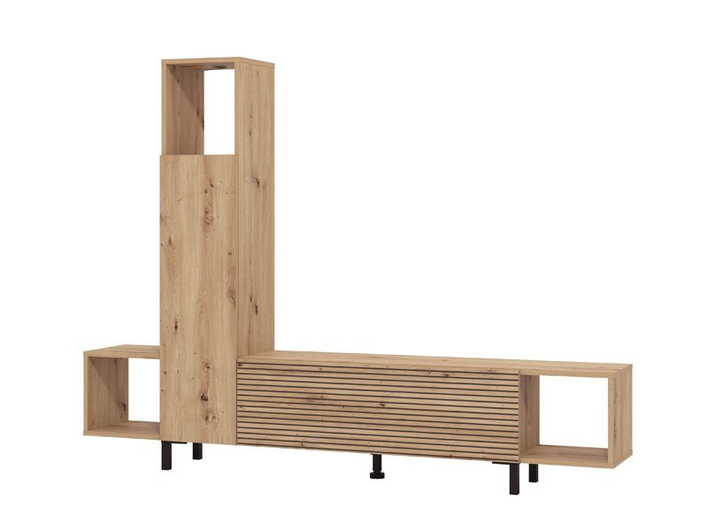 Das Regal ANDROS kombiniert Artisan-Eiche-Dekor mit Artisan-Eiche mit Streifen und bietet eine moderne und funktionale Lösung für die Gestaltung des Wohnzimmers. Mit kompaktem und reduziertem Design ermöglicht das Regal ANDROS eine praktische Raumeinrichtung dank offener und geschlossener Regalen sowie einer Fläche für Fernsehgeräte bis zu 50". Dank der gut durchdachten Stauraumaufteilung fügt es sich problemlos in moderne Wohnambiente ein.