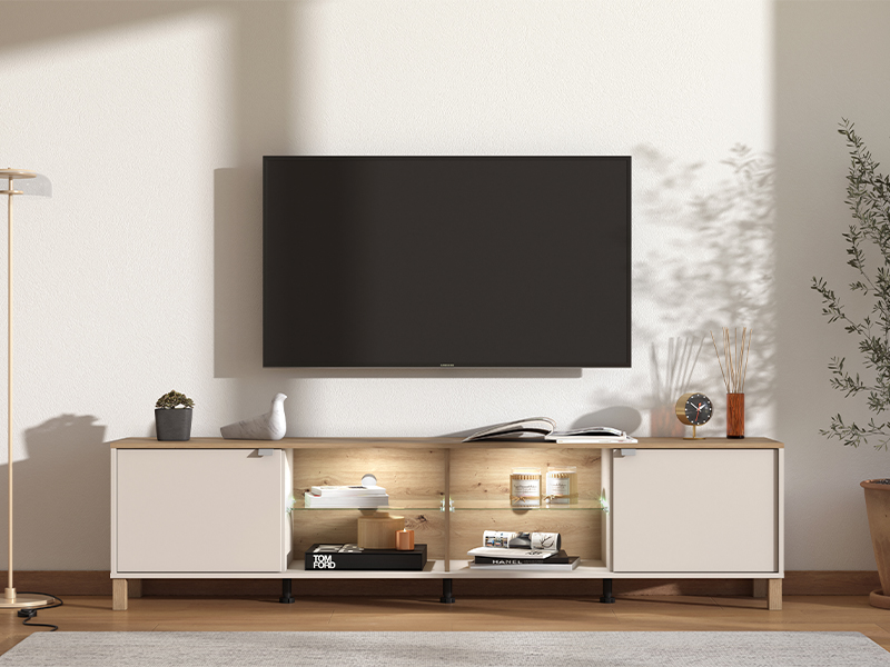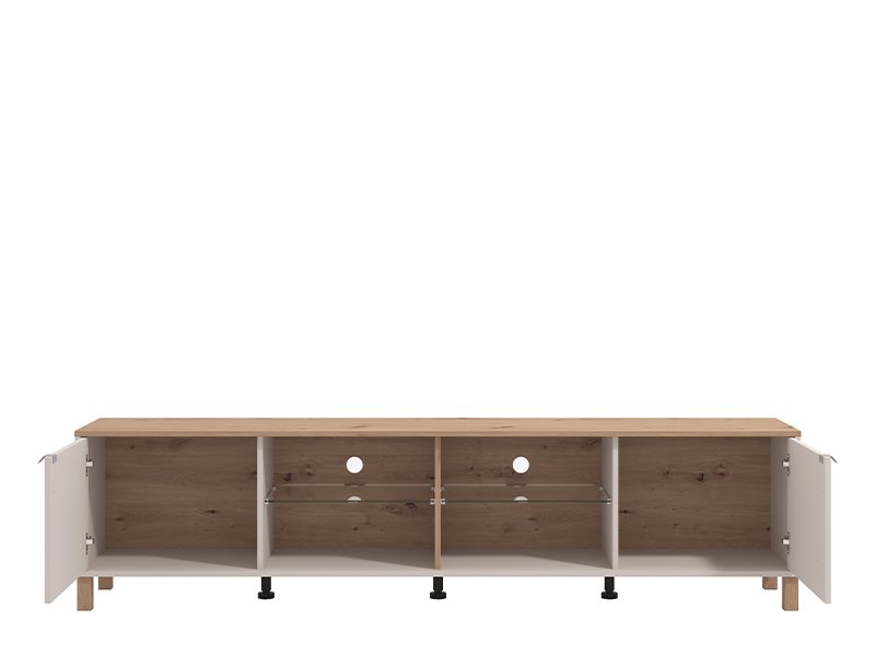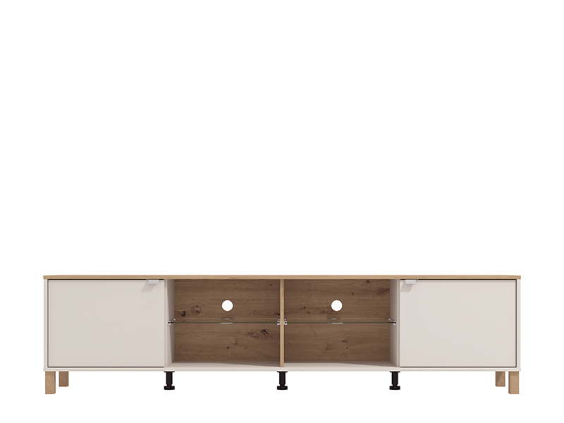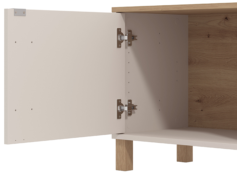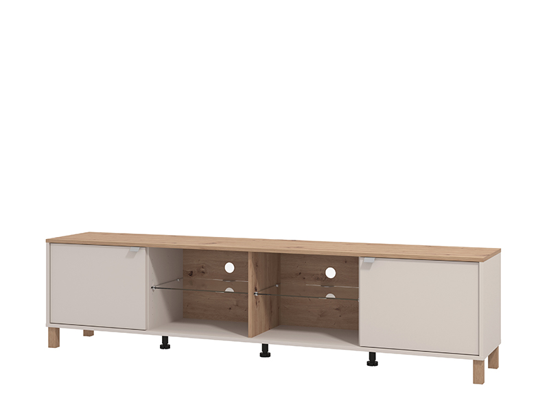 Das Fernsehregal LINEAL TV 208 4K2V ist ein funktionales Zubehör für die Einrichtung des Wohnzimmers. Die Kombination der Dekore Kaschmir und Artisan Eiche Folie verleiht dem Raum einen Hauch von Eleganz und Gemütlichkeit mit einem raffinierten Ausdruck des Stils, den moderne Innenräume erfordern. Zwei seitliche geschlossene Segmente und offene Regale tragen effektiv zur funktionalen Organisation des Wohnzimmers bei.
