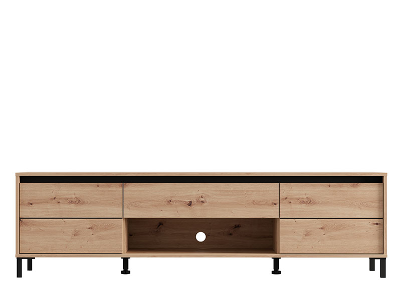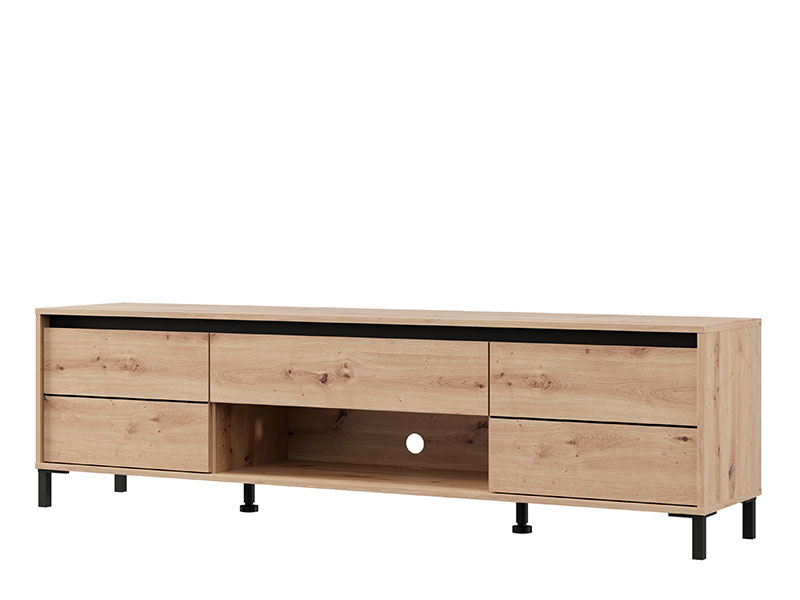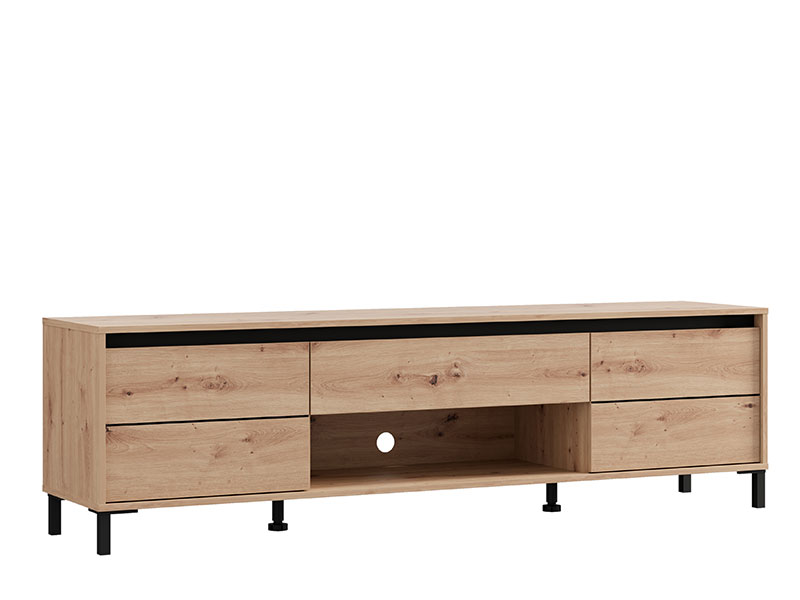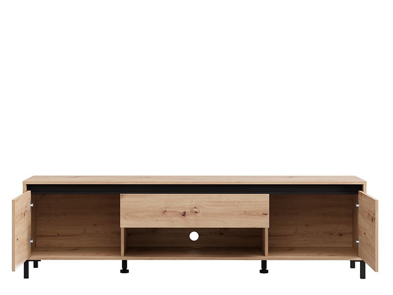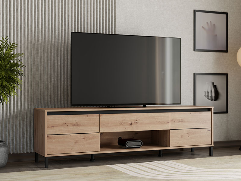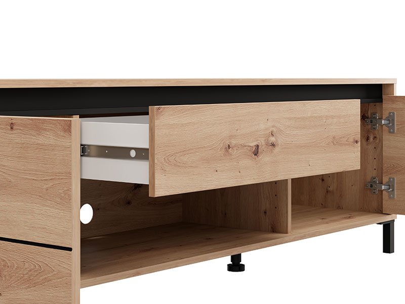 Das Fernsehregal MARRON TV 183 3K1F2V in der Dekorkombination Artisan-Eiche und mattschwarzer Folie verleiht dem Raum natürliche Wärme sowie einen modernen visuellen Kontrast. Der Stauraum besteht aus zwei geschlossenen Fächern, einem offenen Regal und einer Schublade, die eine praktische und organisierte Aufbewahrung von Mediengeräten, Büchern und Dekorationsdetails ermöglichen. Das Fernsehregal MARRON TV 183 3K1F2V ist Teil des MARRON-Elementsystems, welches sich durch die harmonische Verbindung rustikaler Farbtöne mit der Funktionalität eines modernen Designs auszeichnet.