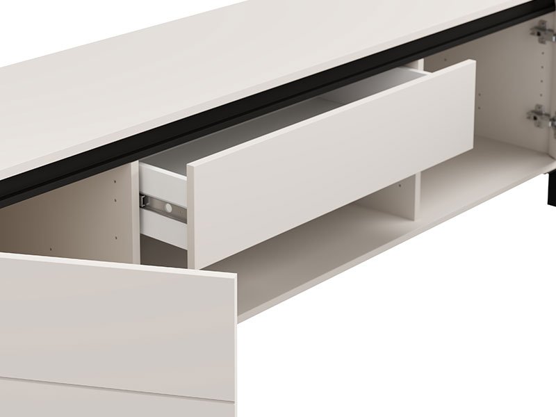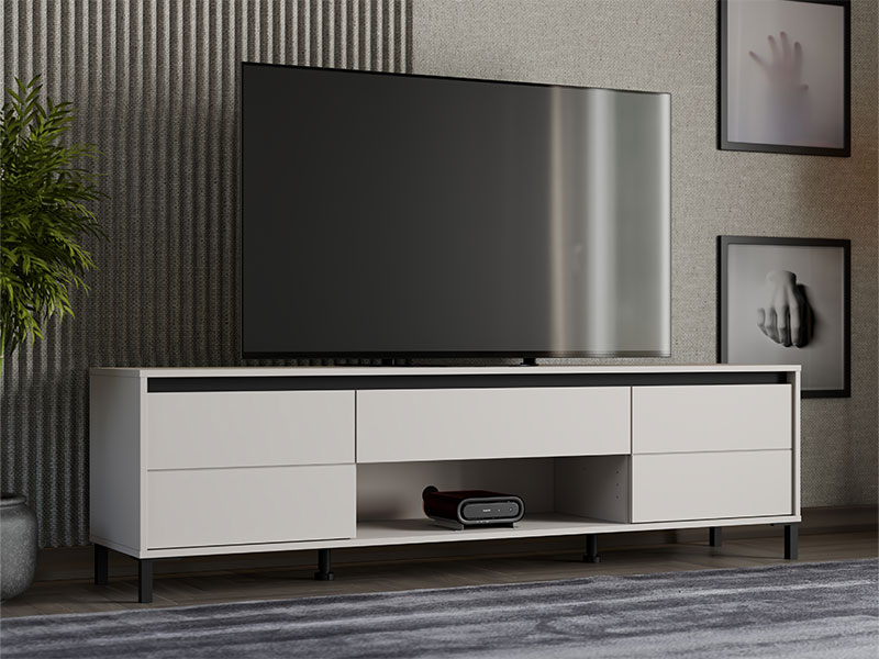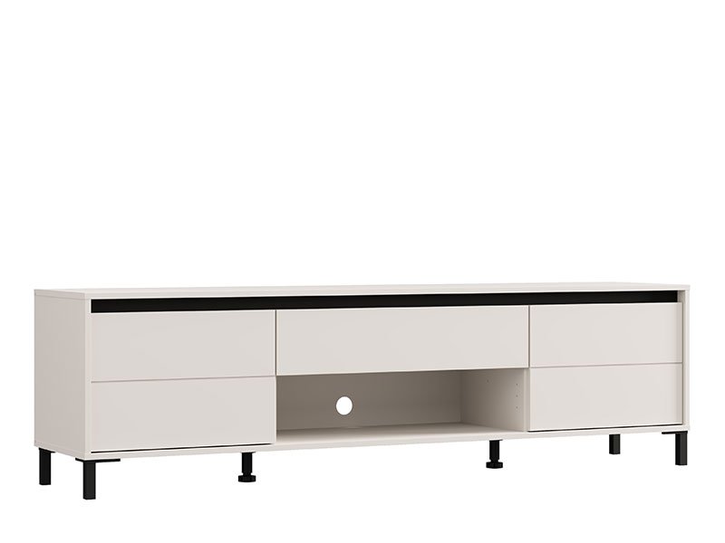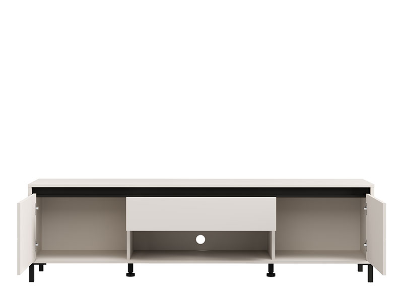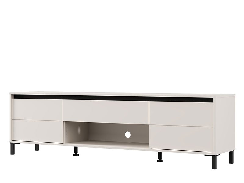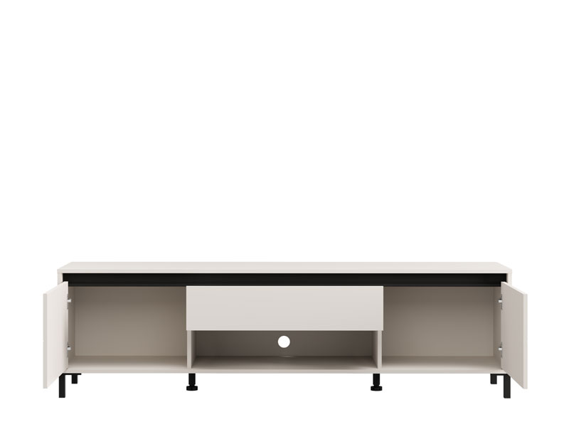 Das Fernsehregal MARRON TV 183 3K1F2V in der Dekorkombination Kaschmir und mattschwarzer Folie verleiht dem Raum einen modernen visuellen Kontrast und anspruchsvolle Wärme. Der Stauraum besteht aus zwei geschlossenen Fächern, einem offenen Regal und einer Schublade, die eine praktische und organisierte Aufbewahrung ermöglichen. Das Fernsehregal MARRON TV 183 3K1F2V ist Teil des MARRON-Elementsystems, welches sich durch die harmonische Verbindung moderner Farbtöne mit der Funktionalität eines zeitgenössischen Designs auszeichnet.