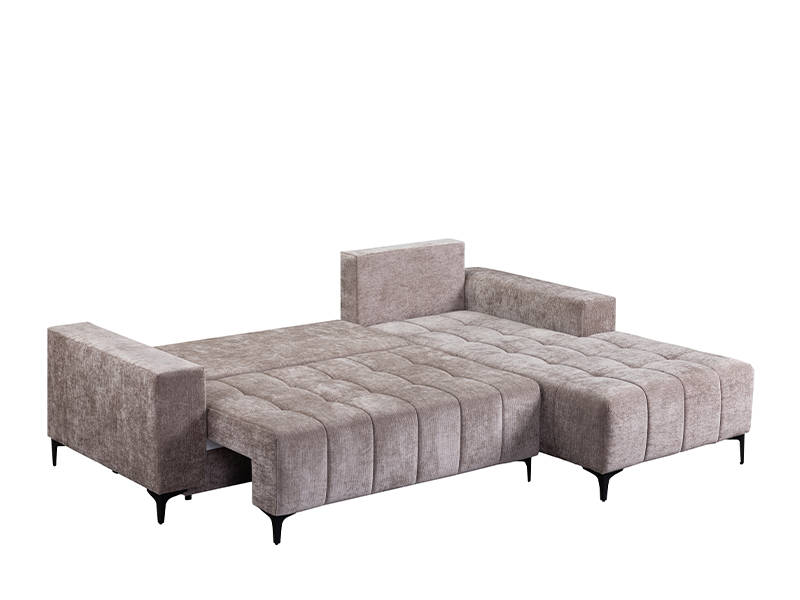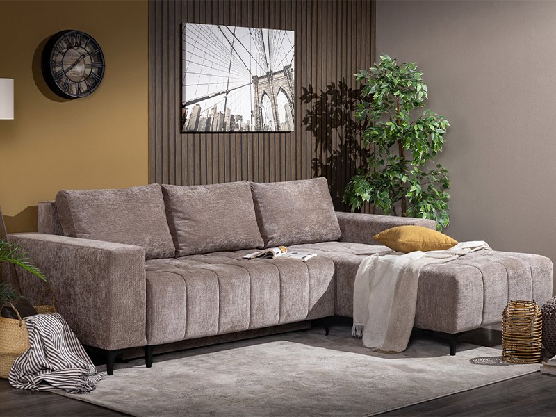 Der genaue Bezeichnung des Stoffmusters lautet: Stoff VIBE 21 braun, rechte Eckausführung. Die Eckgarnitur BOGOTA besticht durch ihr modernes und elegantes Design und ist ideal für zeitgemäß eingerichtete Wohnbereiche. Durch ein praktisches System zum Umklappen der Rückenlehne lässt sie sich mühelos in ein Bett mit einer Schlaffläche von 134 x 200 cm verwandeln. Sie ist aus Schaumstoff gefertigt und bietet ein gutes Komfortniveau für den täglichen Gebrauch. Die Garnitur verfügt über einen Aufbewahrungskasten, der sich gut zum Verstauen von Bettwäsche oder anderen benötigten Gegenstände eignet.