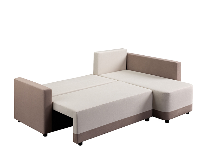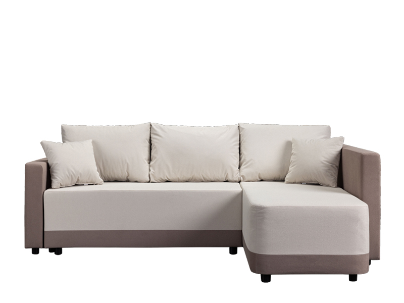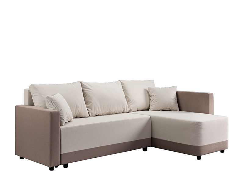Der genaue Bezeichnung des Stoffmusters lautet: Stoff SAND 03 beige / Stoff SAND 16 hellbraun. Die Eckgarnitur SELENA mit ihrer modernen und harmonischen Form erfüllt ideal die vielseitigen Anforderungen bei der Einrichtung von Wohnbereichen. Durch ein einfaches System zum Umklappen der Rückenlehne lässt sie sich mühelos in ein Bett mit einer Schlaffläche von 115 x 200 cm verwandeln. Die Garnitur ist aus Schaumstoff gefertigt und bietet ein gutes Komfortniveau für den täglichen Gebrauch. Sie verfügt zudem über einen Aufbewahrungskasten, praktisch für Bettwäsche und andere Gegenstände. Die universale Eckausführung ermöglicht eine einfache Integration in verschiedene Raumgestaltungen.