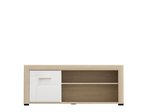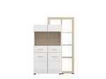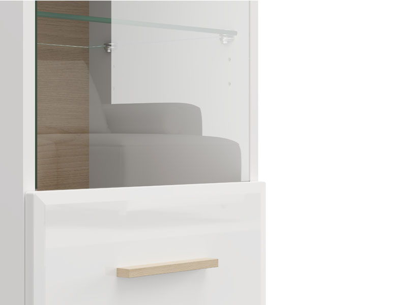 Die Vitrine CARLOW 1K VS1 96 ist ein elegantes Element für die Wohnzimmereinrichtung, das Funktionalität mit modernem ästhetischem Ausdruck vereint. Die Kombination aus opak-weißen Dekor, weißer Hochglanzfolie und heller Port-Eiche verleiht dem Raum Eleganz, Wärme und visueller Ausgewogenheit mit klar definierten Linien und modernem Charakter. Der teilverglaste Bereich trägt zum attraktiven Erscheinungsbild bei und ermöglicht die Präsentation von Dekorationsdetails, während das geschlossene Segment praktischen Stauraum bietet. Die Vitrine ist Teil des CARLOW-Elementsystems zur Wohnzimmereinrichtung und stellt eine harmonische Ergänzung zum gesamten Designkonzept dar. Der Einbau zusätzlicher LED-Beleuchtung kann optional erfolgen.