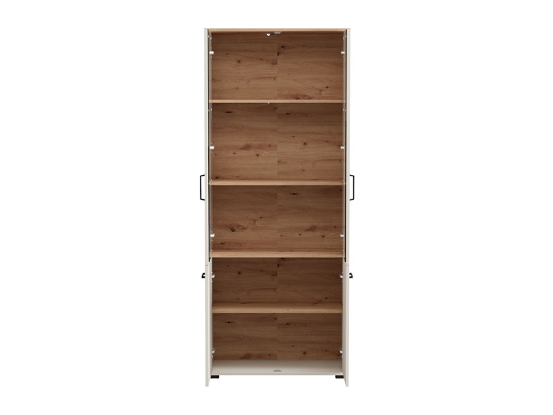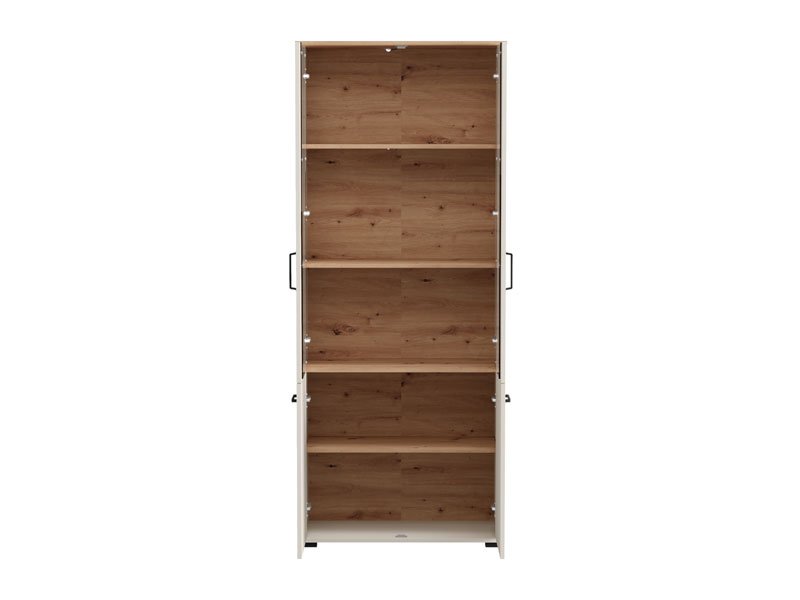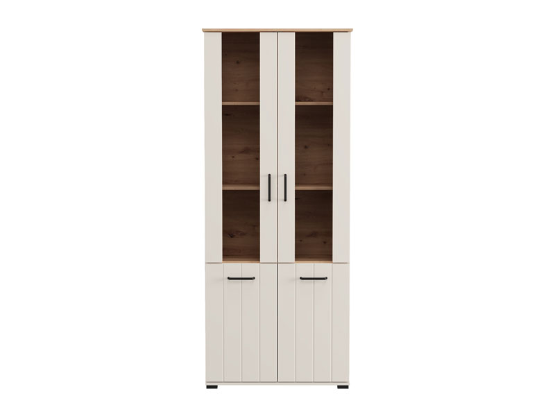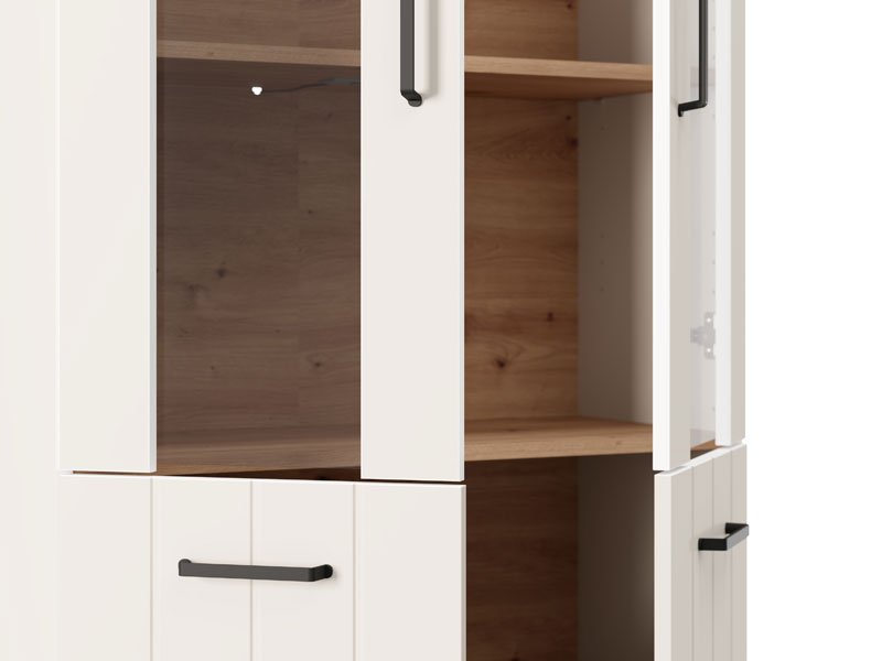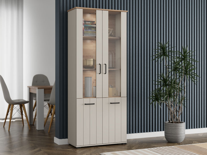 Die Vitrine LAMBETH 2K VS2 191 in der Dekorkombination Kaschmir und Artisan-Eiche verleiht dem Raum Wärme und einen rustikalen Charakter dank der speziellen Oberflächenveredelung mit reliefartig eingeprägten Rillen auf den Fronten. Der Stauraum umfasst zwei geschlossene, verglaste Bereiche und zwei geschlossenen Fächern mit praktischen Regalen für die organisierte Aufbewahrung von Gebrauchs- und Dekorationsgegenständen. Die Vitrine LAMBETH 2K VS2 191 ist Teil des LAMBETH-Elementsystems, das sich durch einen ästhetisch ausgeprägten Stil und Funktionalität auszeichnet. Eine optionale LED-Beleuchtung ist erhältlich, wodurch der Raum visuell akzentuiert und zusätzlich ausgeleuchtet wird.
