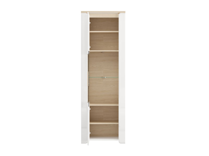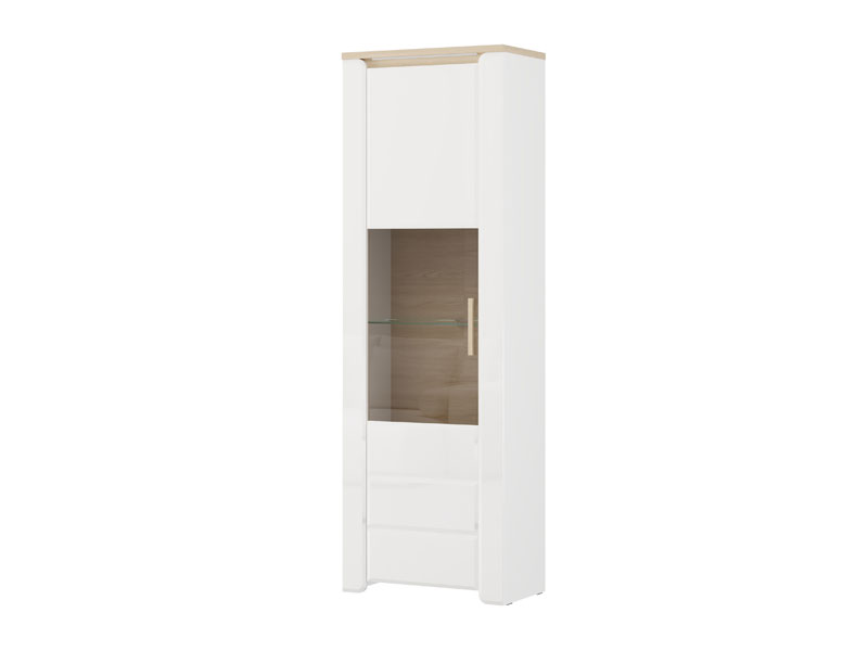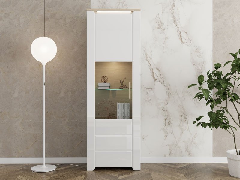 Die Vitrine ABERDEEN 1K VS1 194 kombiniert opak-weißen Dekor mit heller Port-Eiche und weiße Hochglanzfolie und verleiht dem Raum Eleganz und einen minimalistischen und makellosen Stil. Der Stauraum umfasst einen geschlossenen, teilverglasten Bereich mit praktischen Regalen für die organisierte Aufbewahrung von Gebrauchs- und Dekorationsgegenständen. Die Fronten sind mit dezenten Griffen ausgestattet, welche der Designlinie der gesamten Kollektion entsprechen. Die Vitrine ABERDEEN 1K VS1 194 ist Teil des ABERDEEN-Elementesystems, das sich durch ein modernes Erscheinungsbild und Funktionalität auszeichnet. Eine optionale LED-Beleuchtung ist erhältlich, wodurch der Raum visuell akzentuiert und zusätzlich ausgeleuchtet wird.